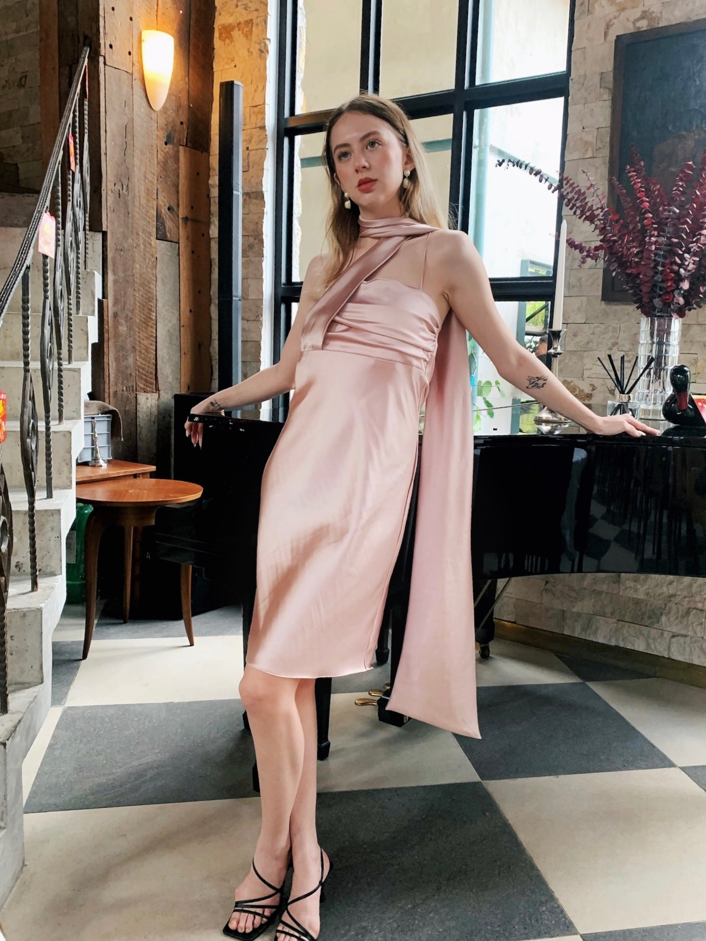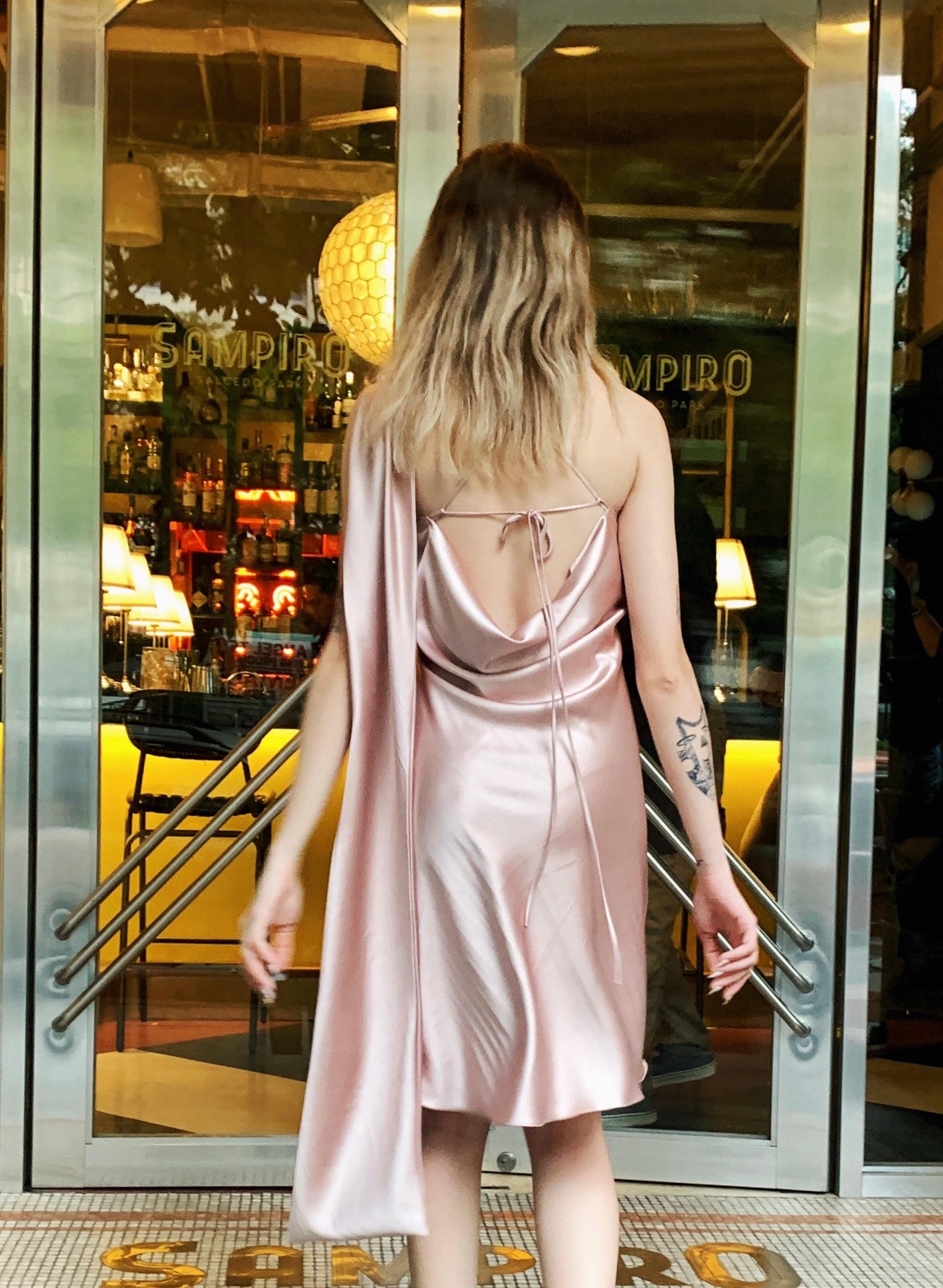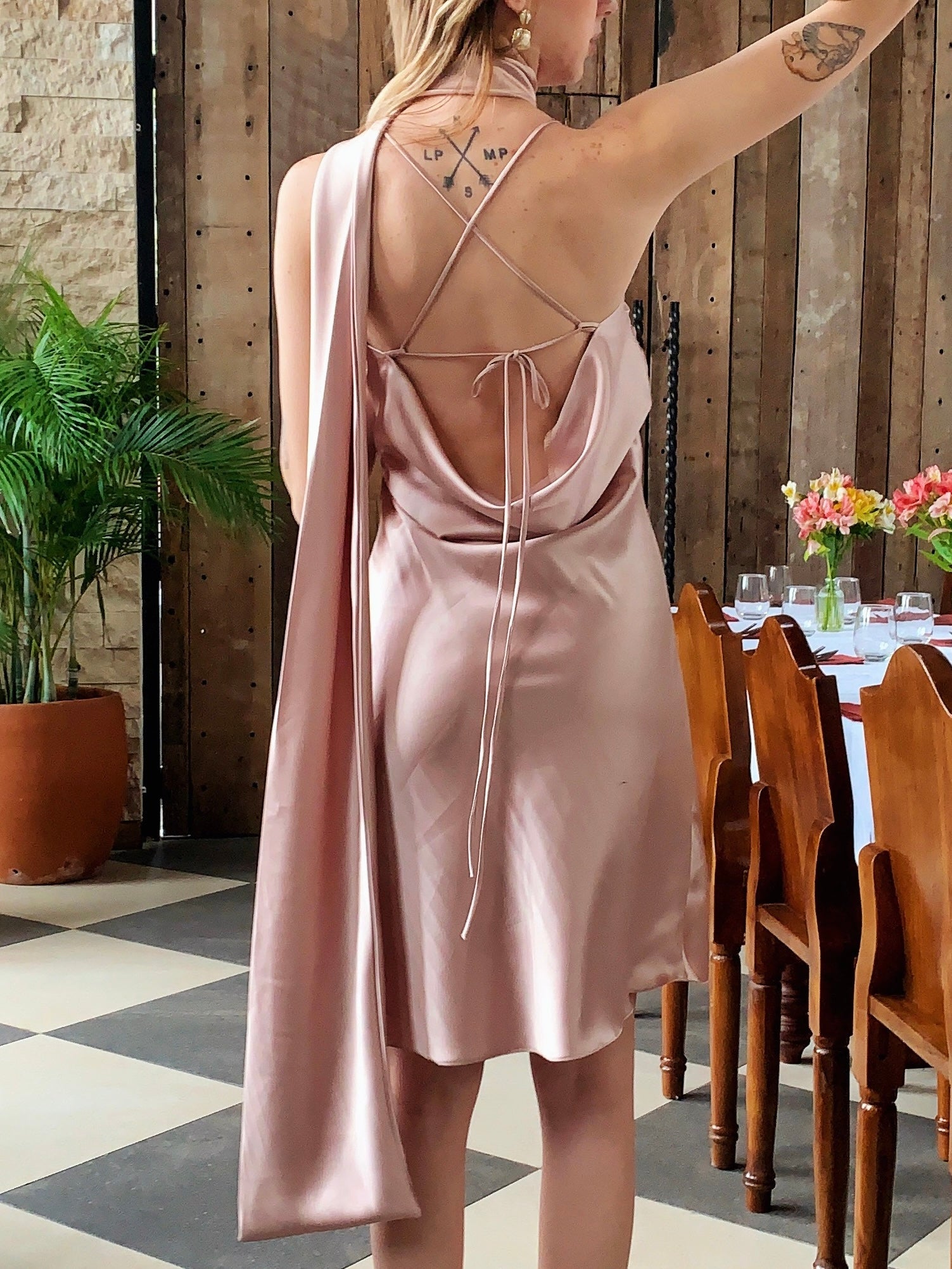 Enhance your wardrobe with this chic champagne mini silk dress. Its versatile design features a free-styling sash, allowing you to wear it as a scarf or cinch the waist as a belt. Effortlessly elegant, it’s perfect for any occasion.