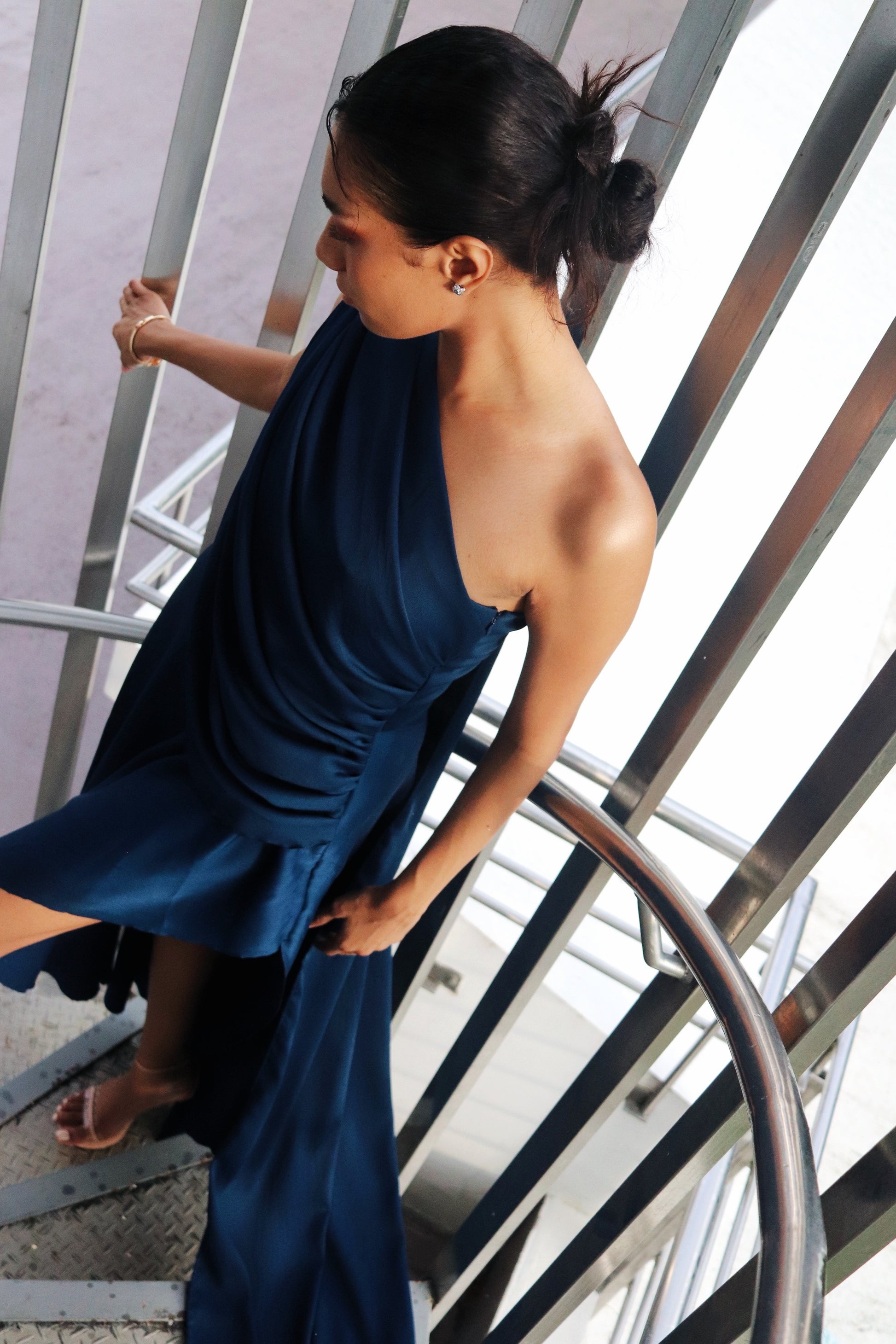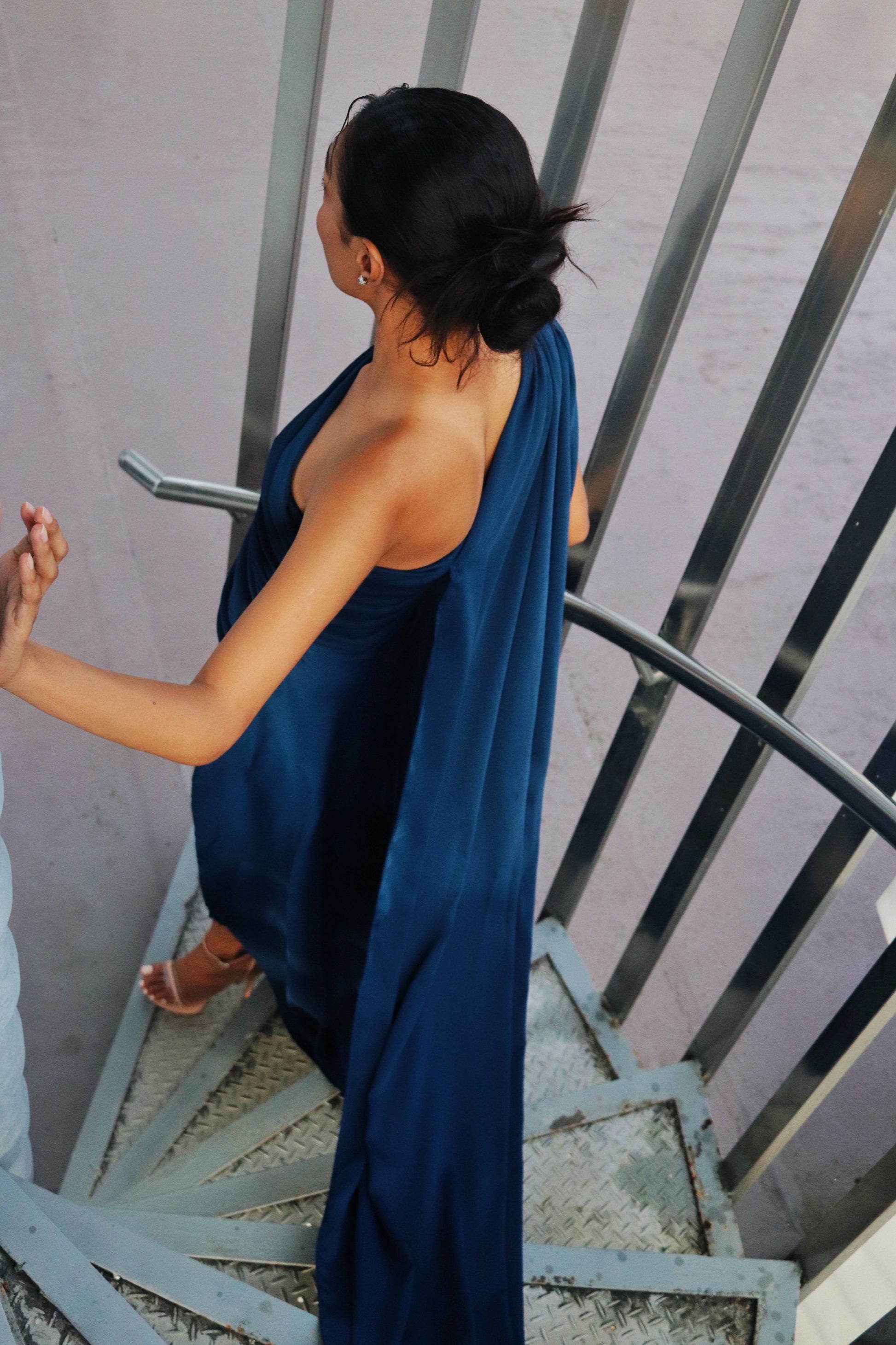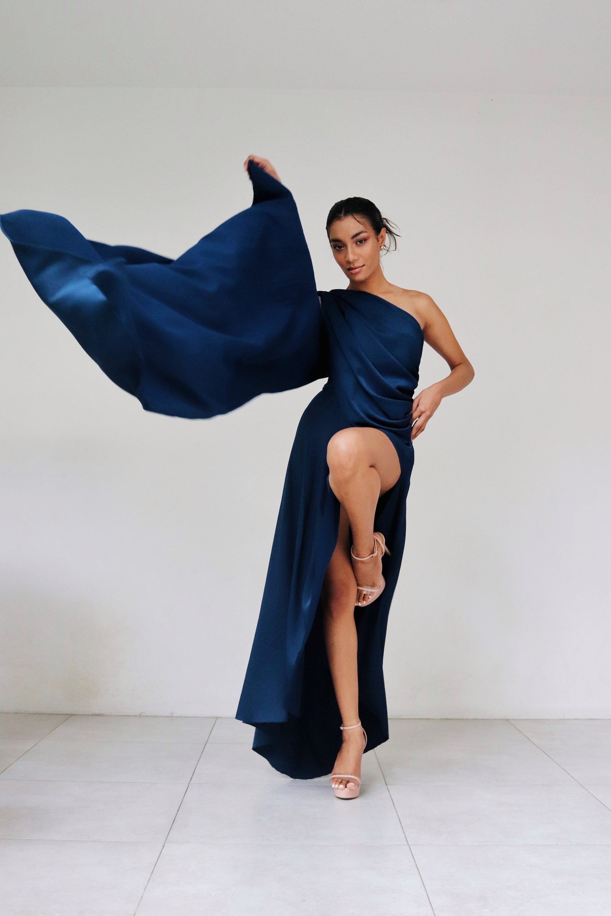 The Asita dress features an off-shoulder neckline and a sultry side slit. The cascading drapes and exaggerated asymmetrical slash add drama to the dress, making it ideal for formal events.