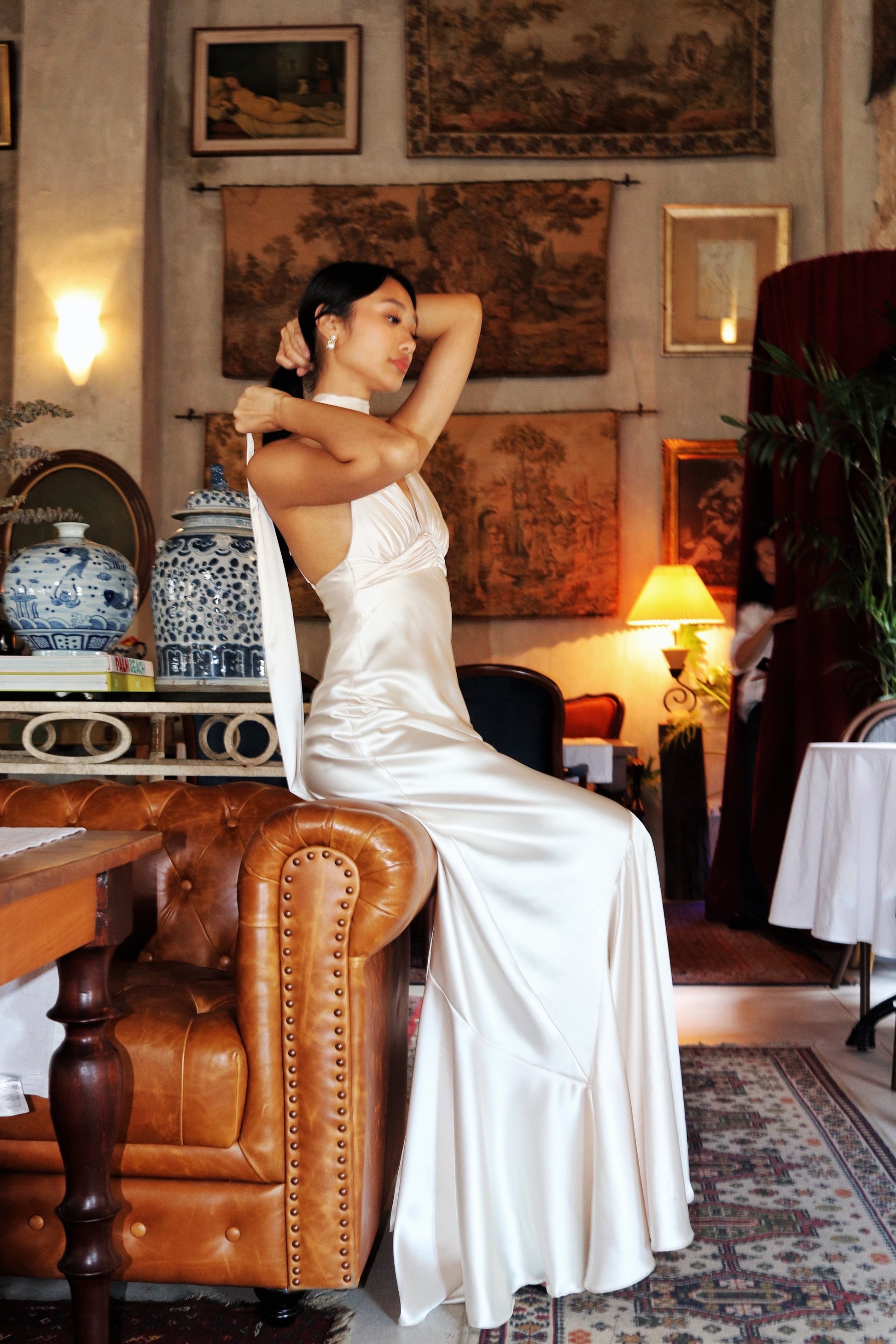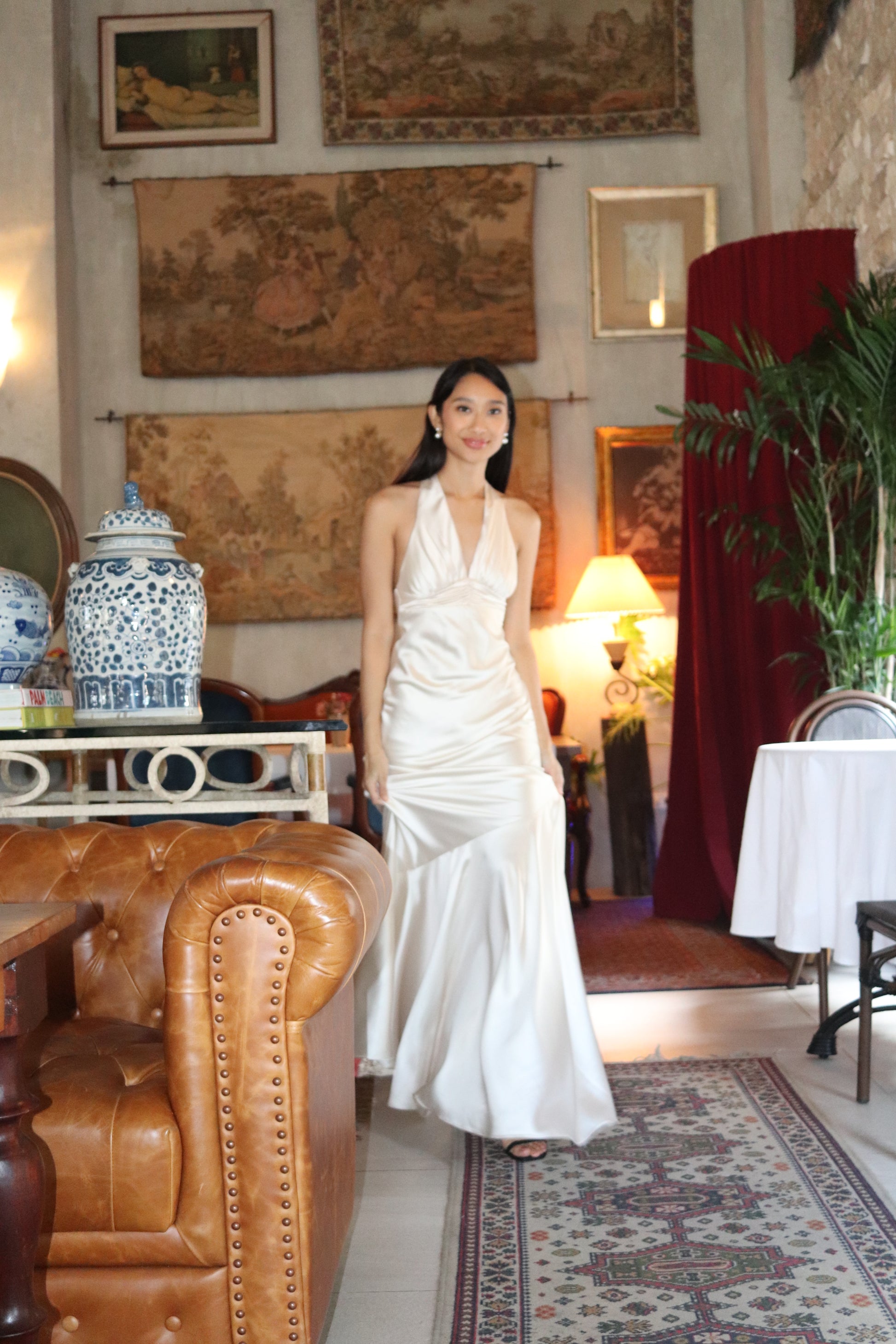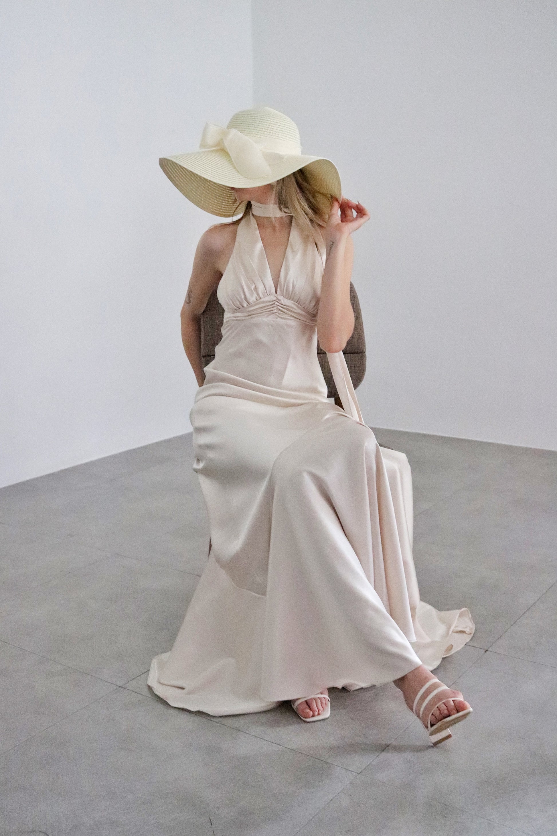A timeless and elegant cream silk halter dress crafted from luxurious silk. Its halter neckline delicately defines the shoulders and its flowing form, which radiates sophistication and class, glides smoothly to the floor. Ideal for elegant events or romantic evenings, this dress is sure to charm with its timeless elegance.