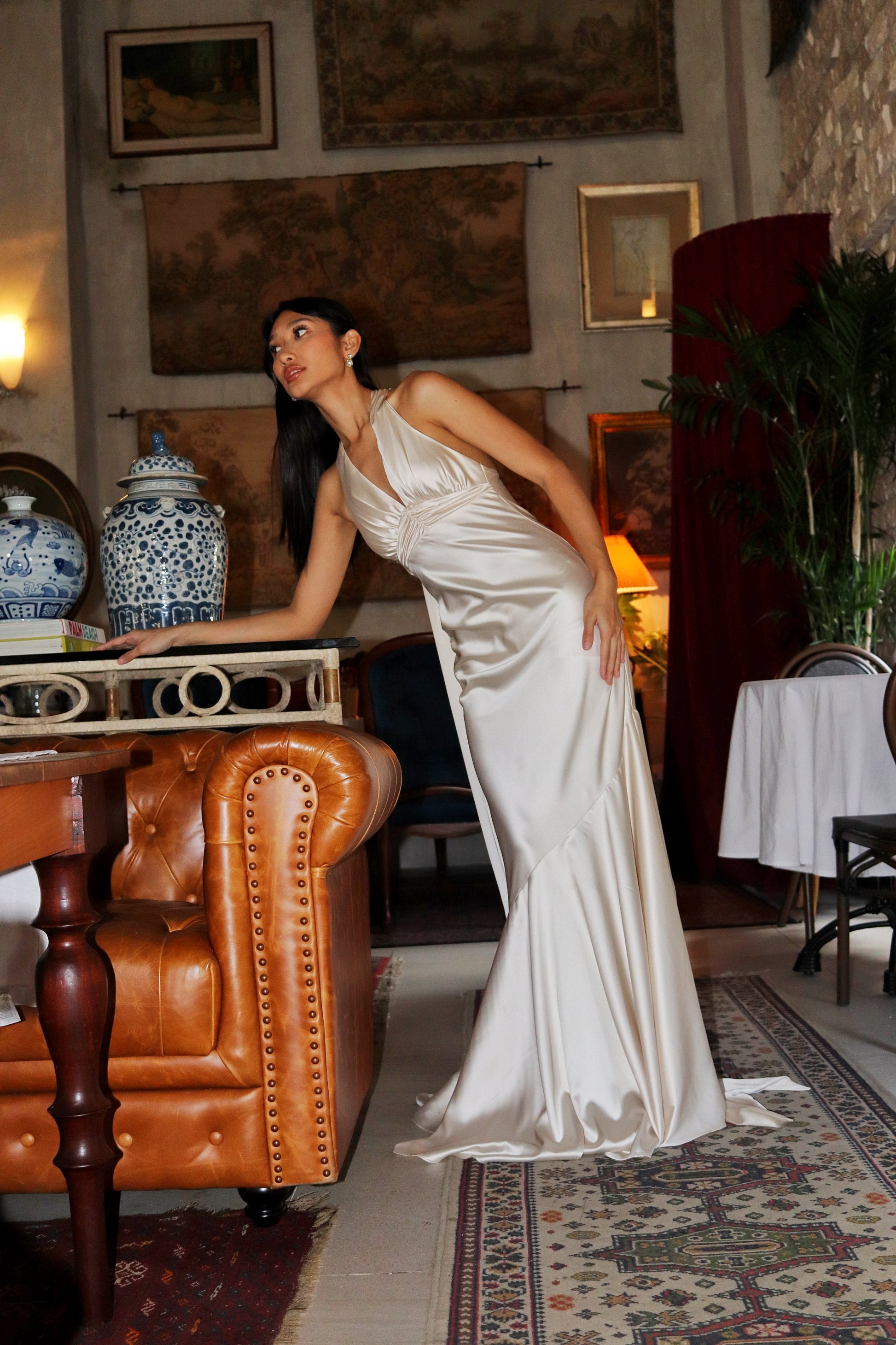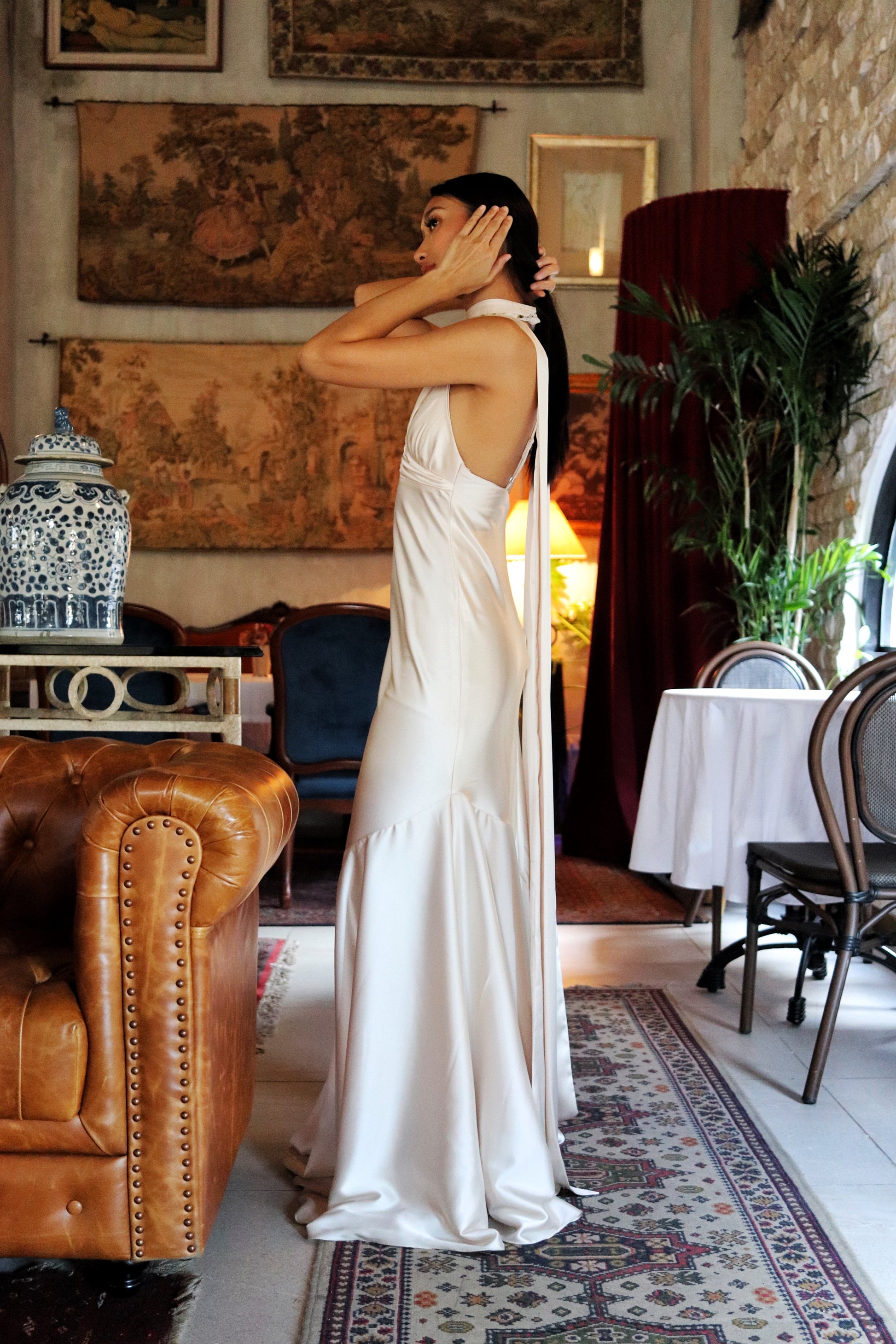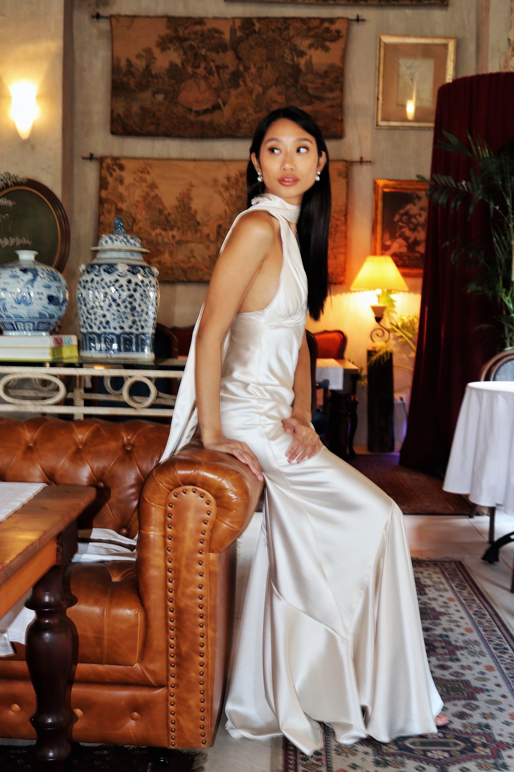 A timeless and elegant cream silk halter dress crafted from luxurious silk. Its halter neckline delicately defines the shoulders and its flowing form, which radiates sophistication and class, glides smoothly to the floor. Ideal for elegant events or romantic evenings, this dress is sure to charm with its timeless elegance.