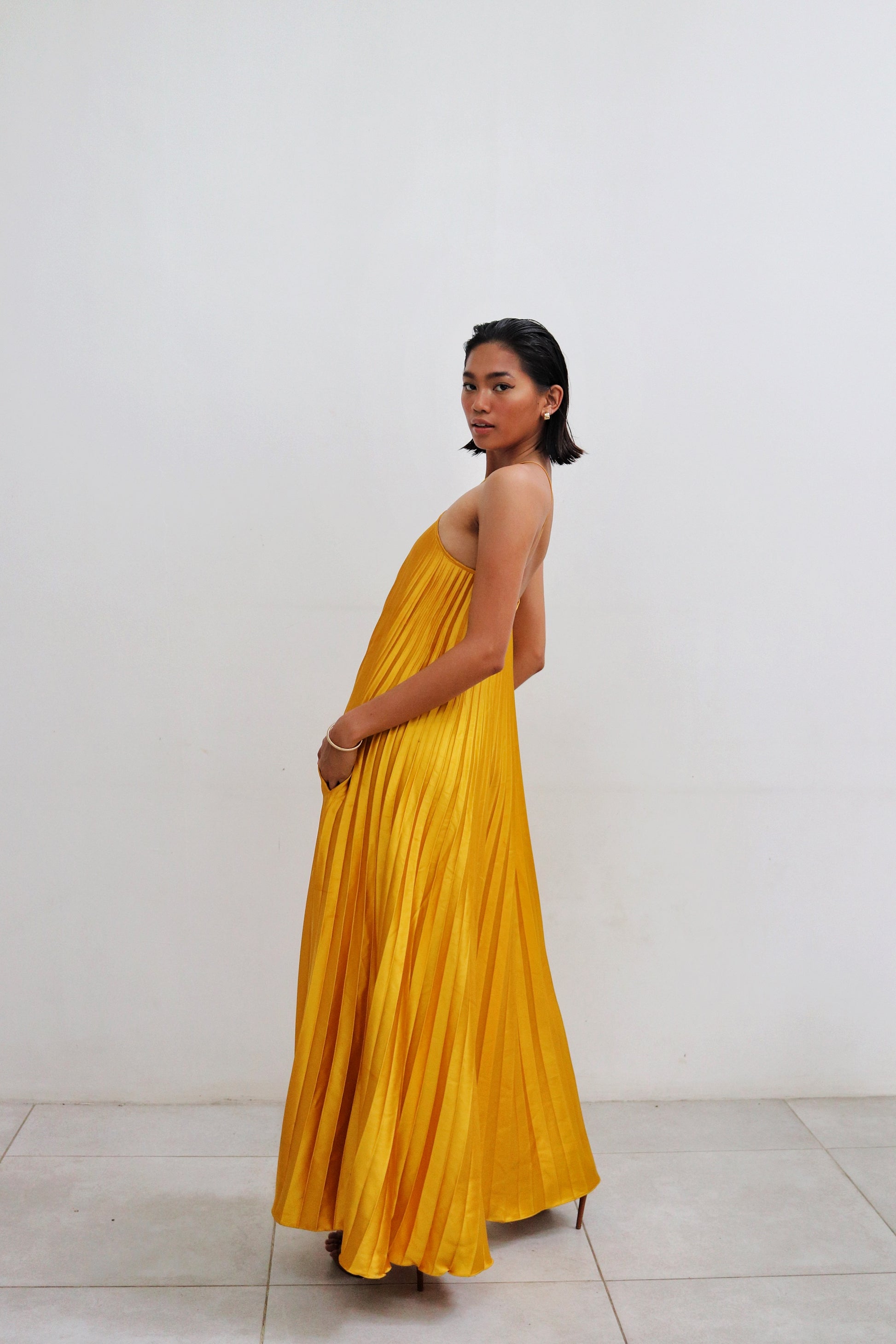 Crafted to evoke a sense of effortless elegance, the Aurelia dress redefines the art of sophisticated ease. The striking triangular halter neckline elongates the silhouette, drawing attention to the shoulders and collarbone with refined grace. Made from a fully electric pleated fabric, the dress offers an undeniable sense of movement, as each pleat flows with delicate fluidity, catching the light with every step. Thoughtfully designed, it features pockets on both sides, adding a modern, practical touch without compromising the dress's graceful drape. The result is a garment that embodies both luxurious comfort and timeless style, ideal for those who seek beauty in both form and function. A masterpiece of relaxed glamour, this dress is a statement of both poise and ease.