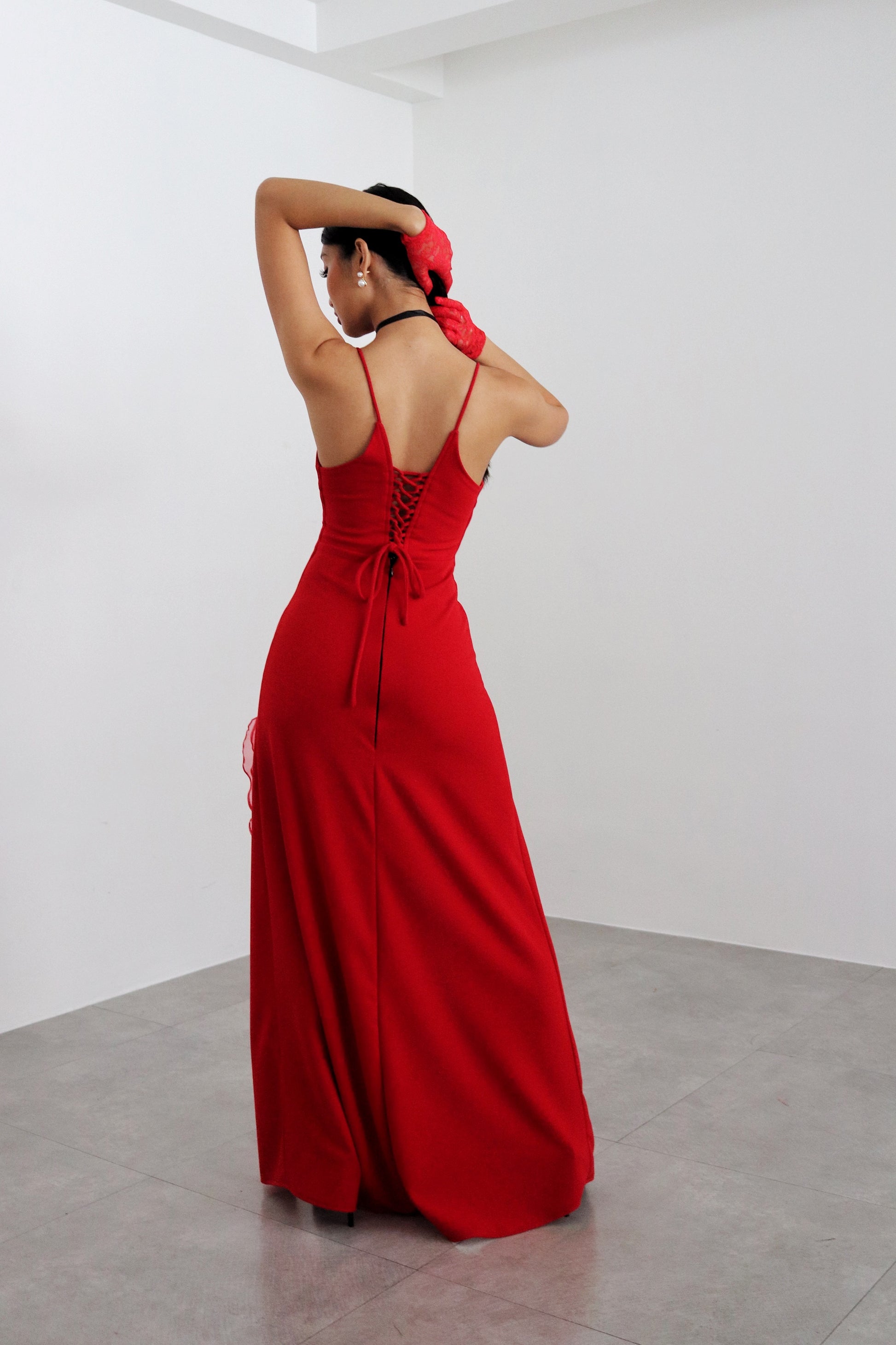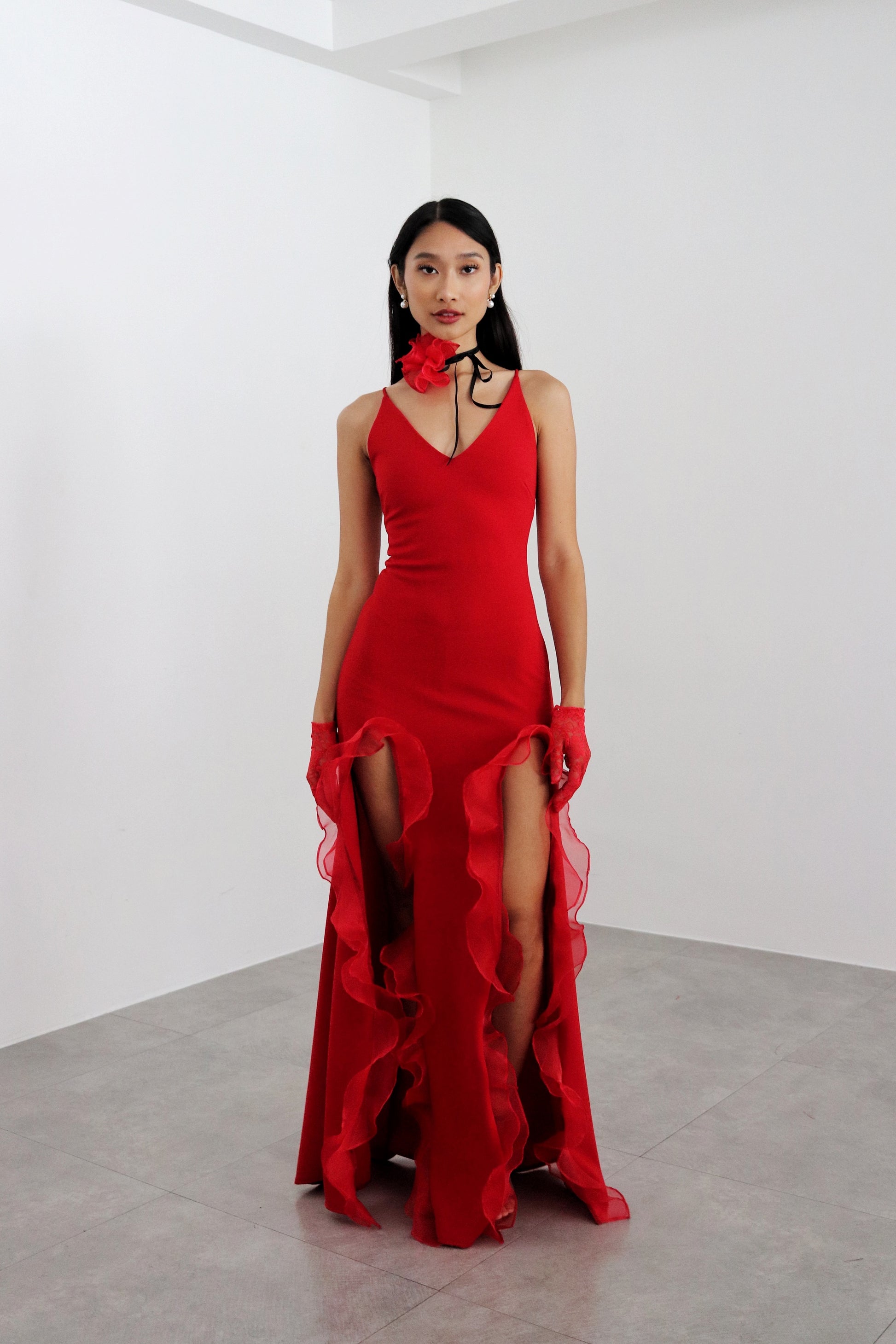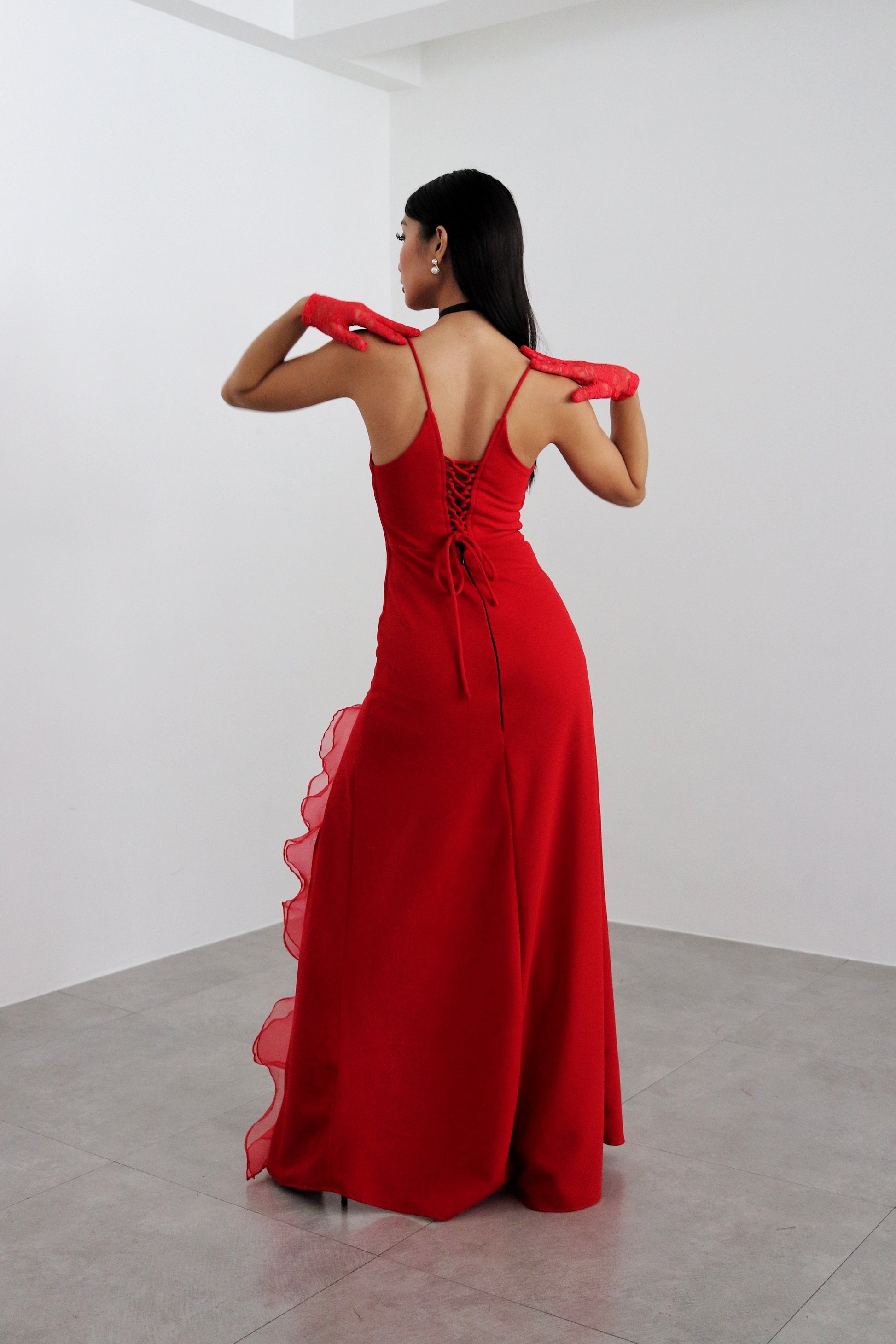 The Catalina dress combines sophistication and romance. Crafted in neoprene and organza, it has a pensile silhouette and two front slits combined with a flower organza choker necklace to complete the look. This piece offers flexible fitting for different sizes with its tensile material and lace-up back. It is characterized by its signature fiery red hue, inspired by salsa evenings.