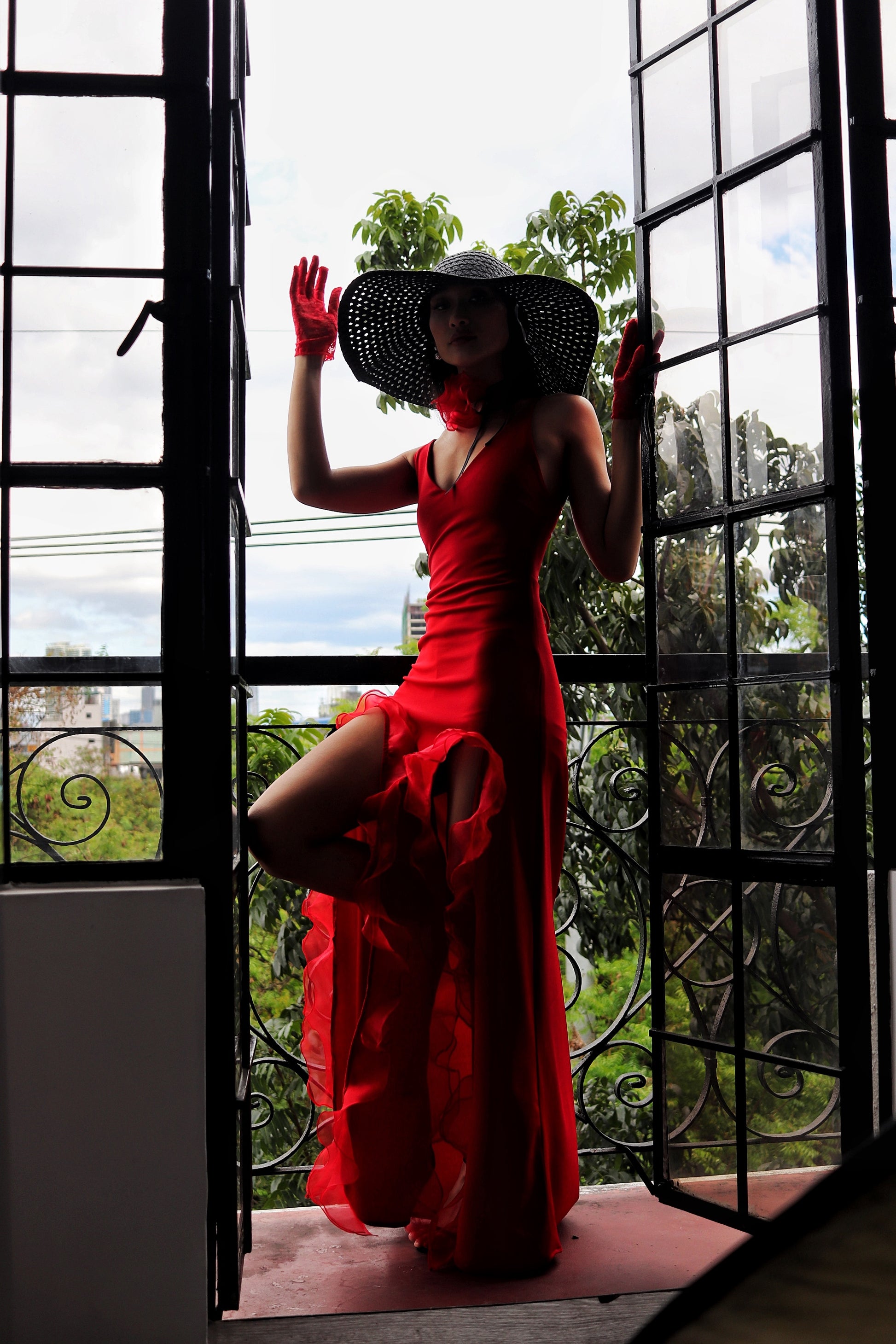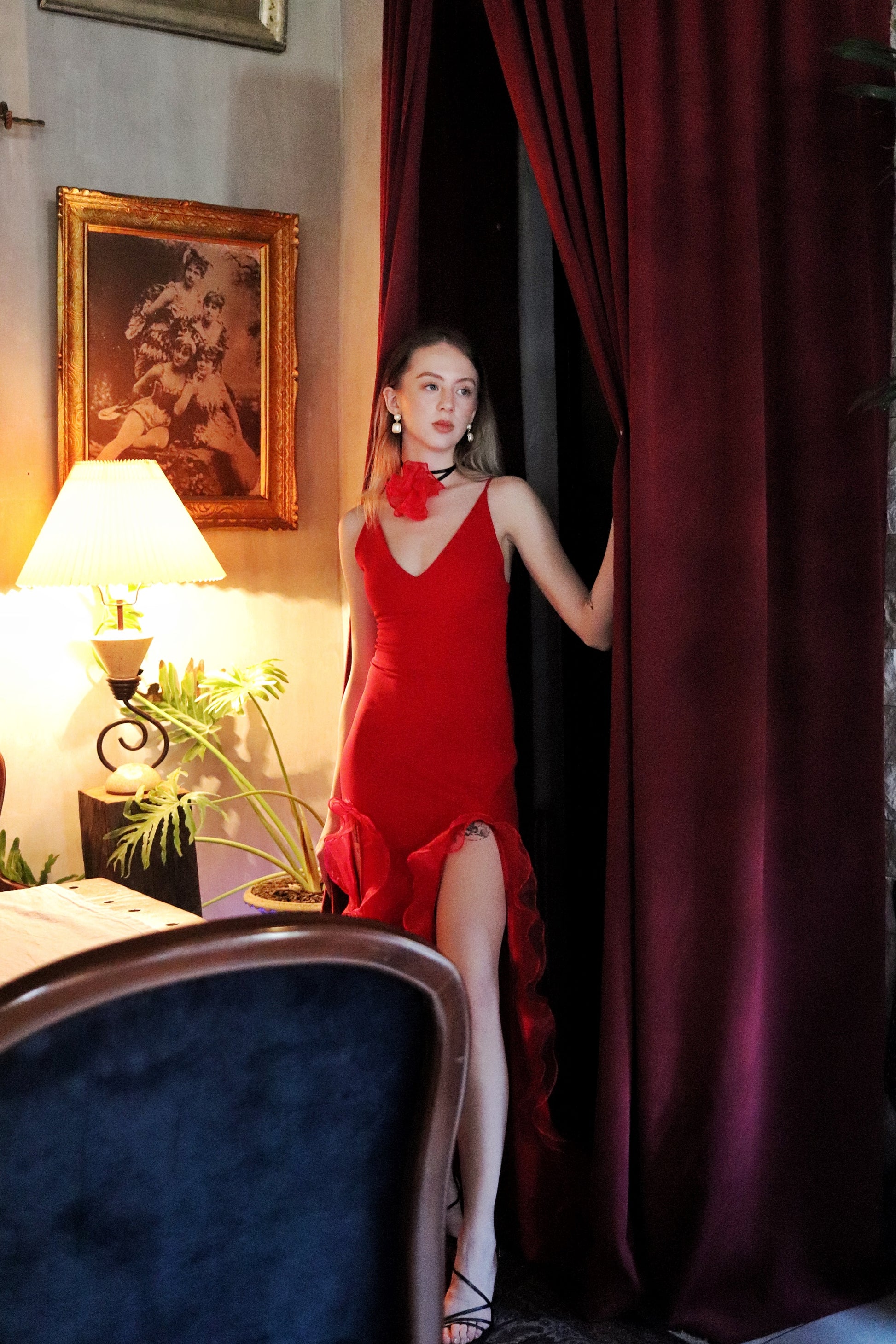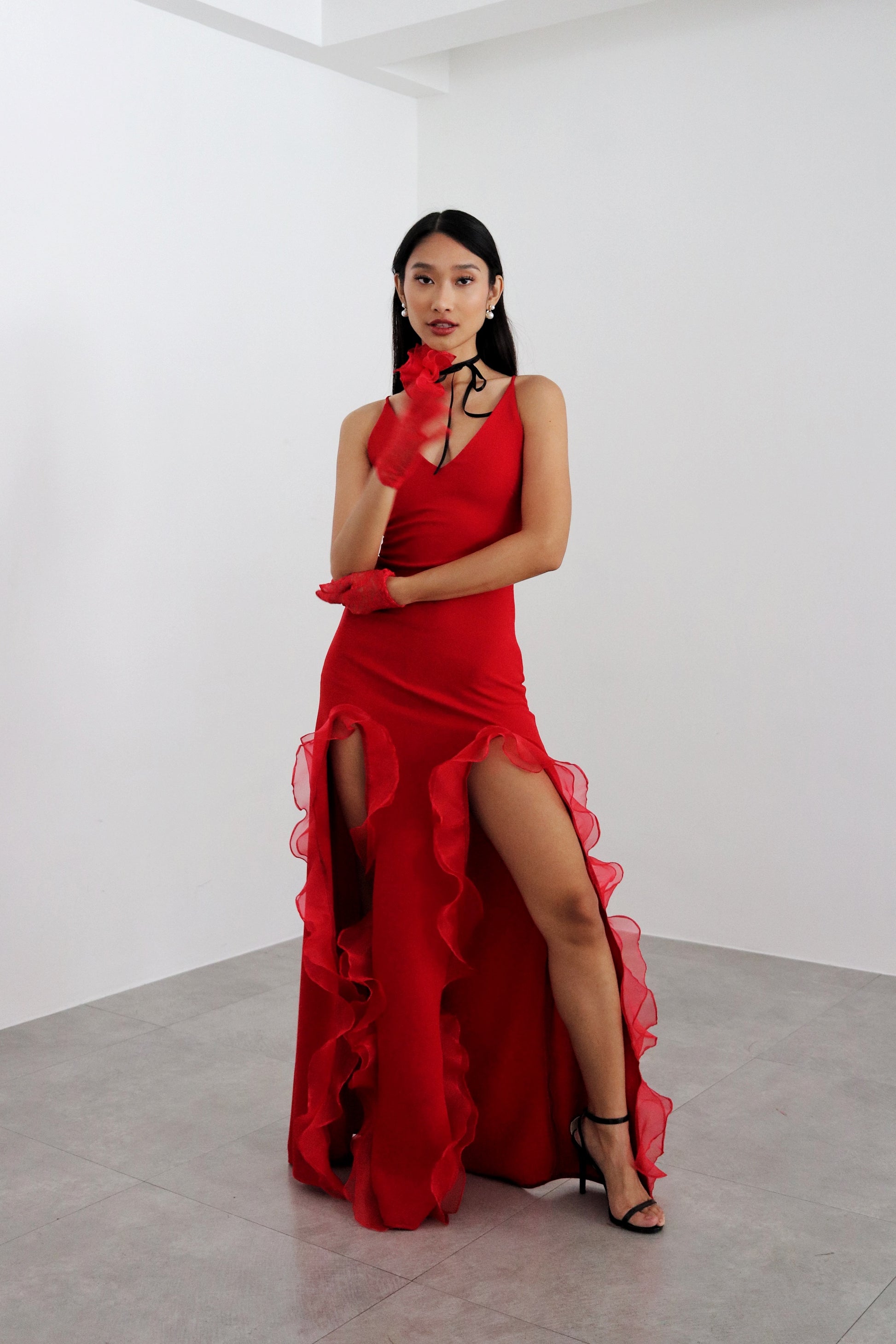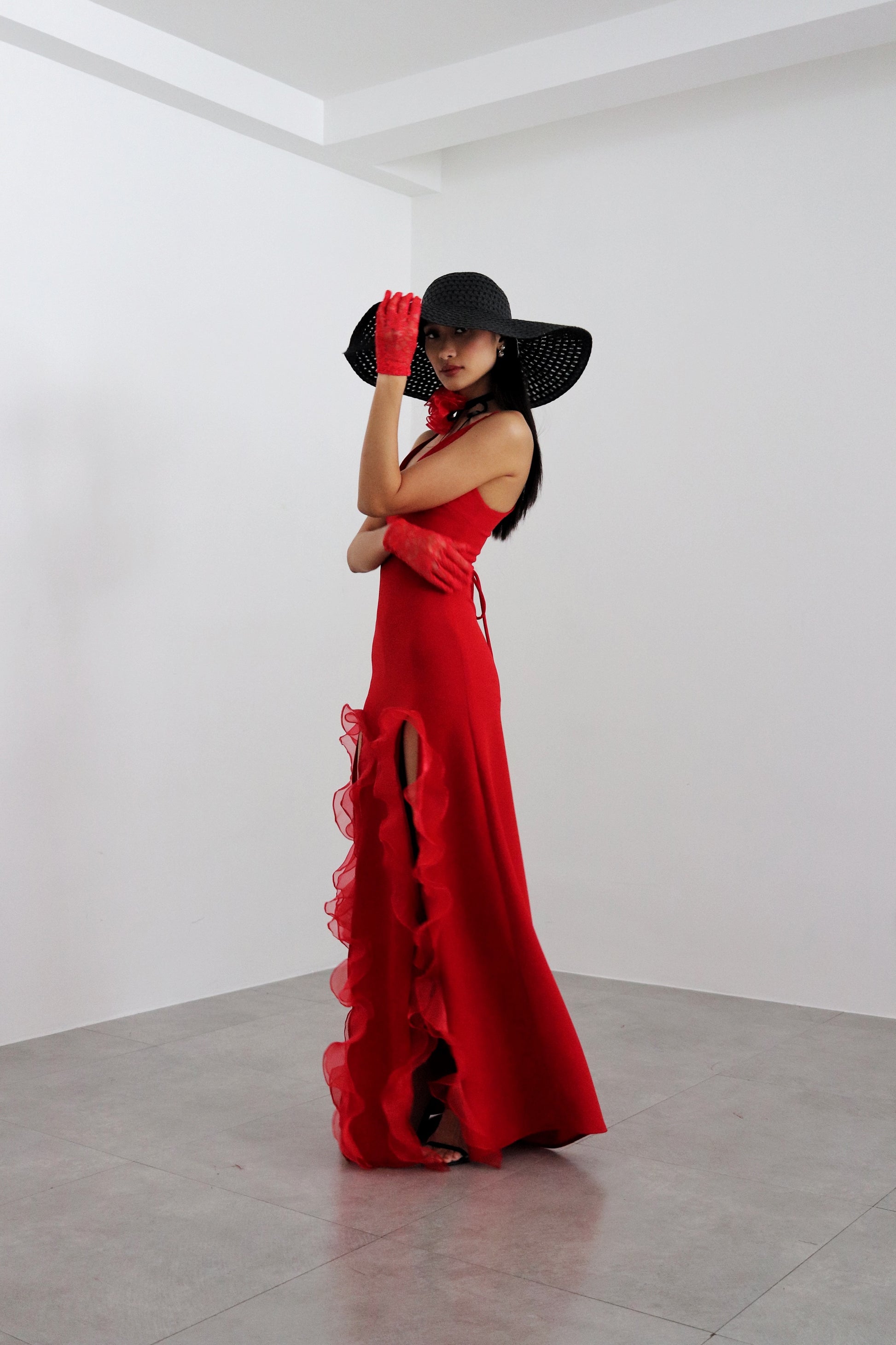 The Catalina dress combines sophistication and romance. Crafted in neoprene and organza, it has a pensile silhouette and two front slits combined with a flower organza choker necklace to complete the look. This piece offers flexible fitting for different sizes with its tensile material and lace-up back. It is characterized by its signature fiery red hue, inspired by salsa evenings.