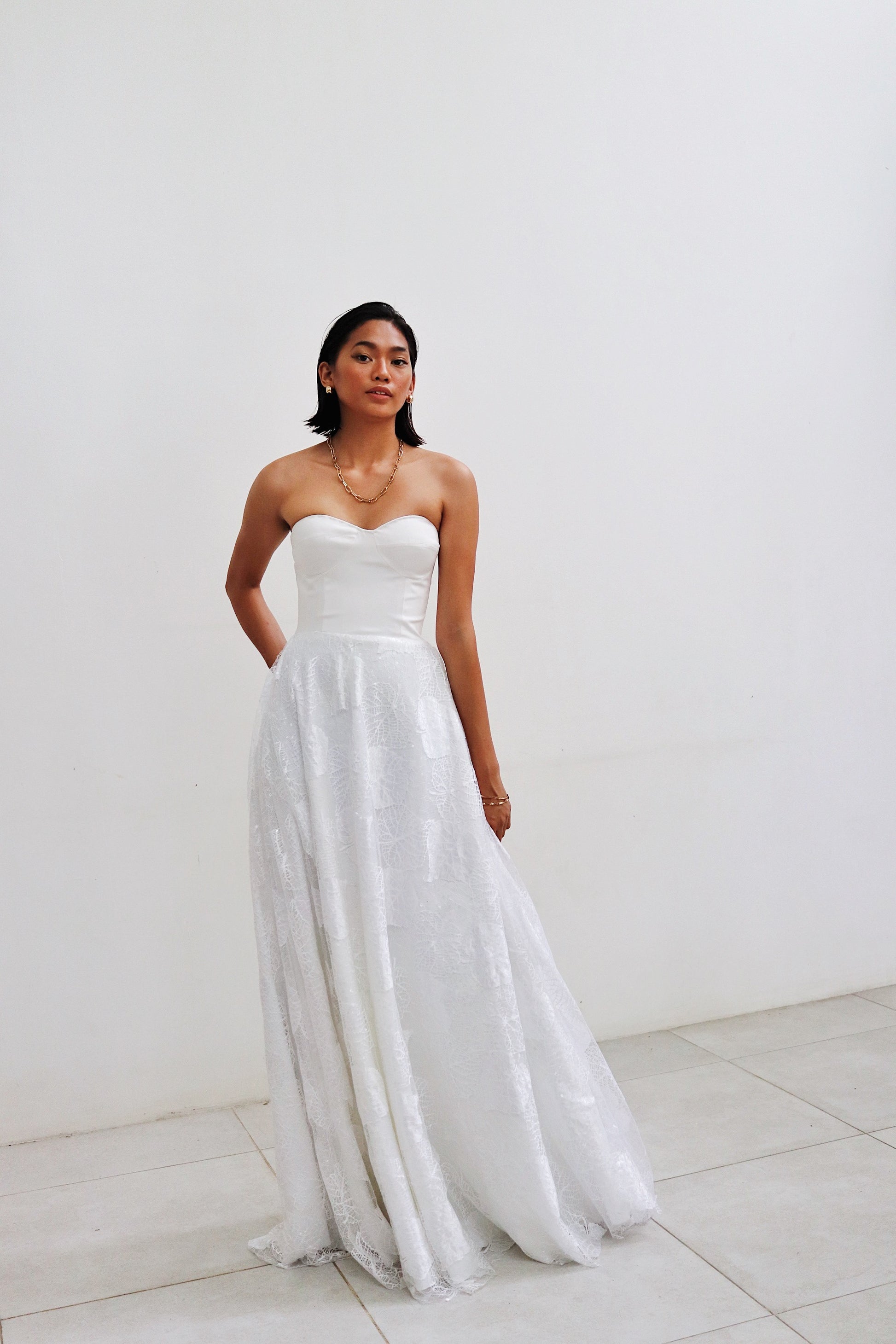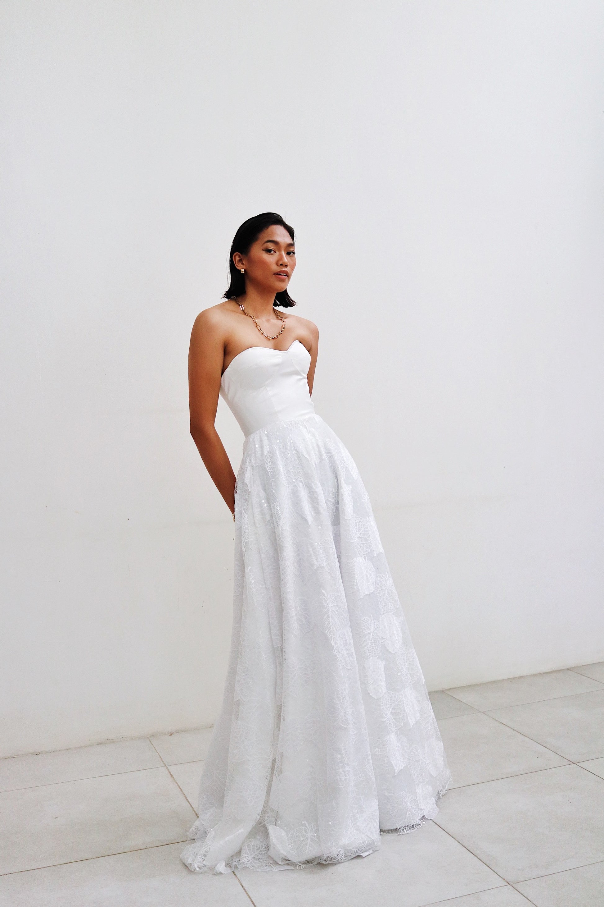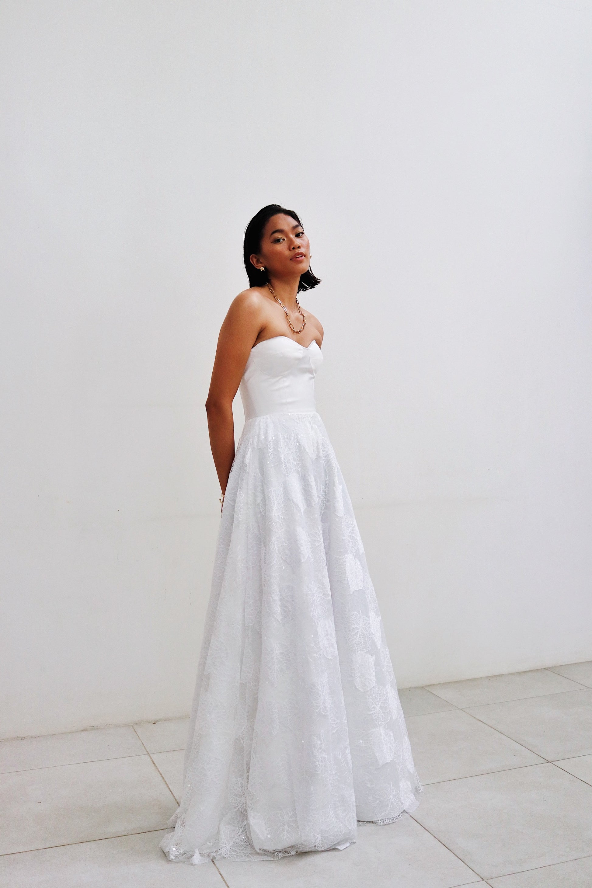 A timeless foundation piece featuring a structured bodice paired with a delicately laced skirt. The highlight of this piece is its exquisite lace skirt, gracefully flowing, which adds a touch of classic charm without ever feeling heavy. Whether you dream of a minimalist look or want to add your embellishments, this gown is the perfect canvas for your unique bridal style.
