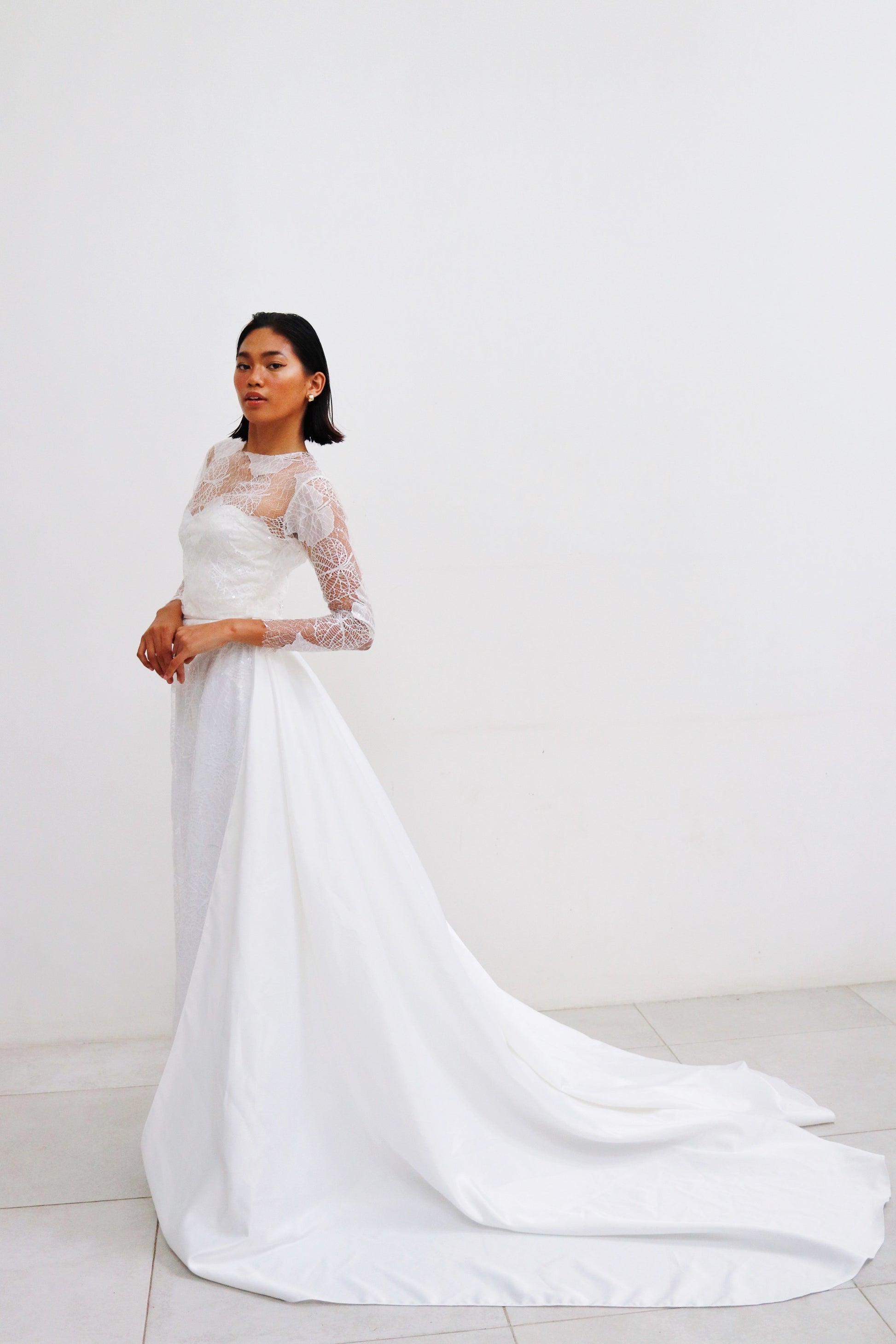 The Cathia Lace Wedding Gown with Long Train is a show-stopping bridal piece designed for brides who dream of making a grand entrance. This gown features a beautifully crafted lace bodice with a romantic sweetheart neckline and intricate floral embroidery, perfectly complemented by a flowing tulle skirt. The highlight of the Cathia gown is its dramatic long train, which adds a touch of regal elegance and ensures all eyes are on you as you walk down the aisle