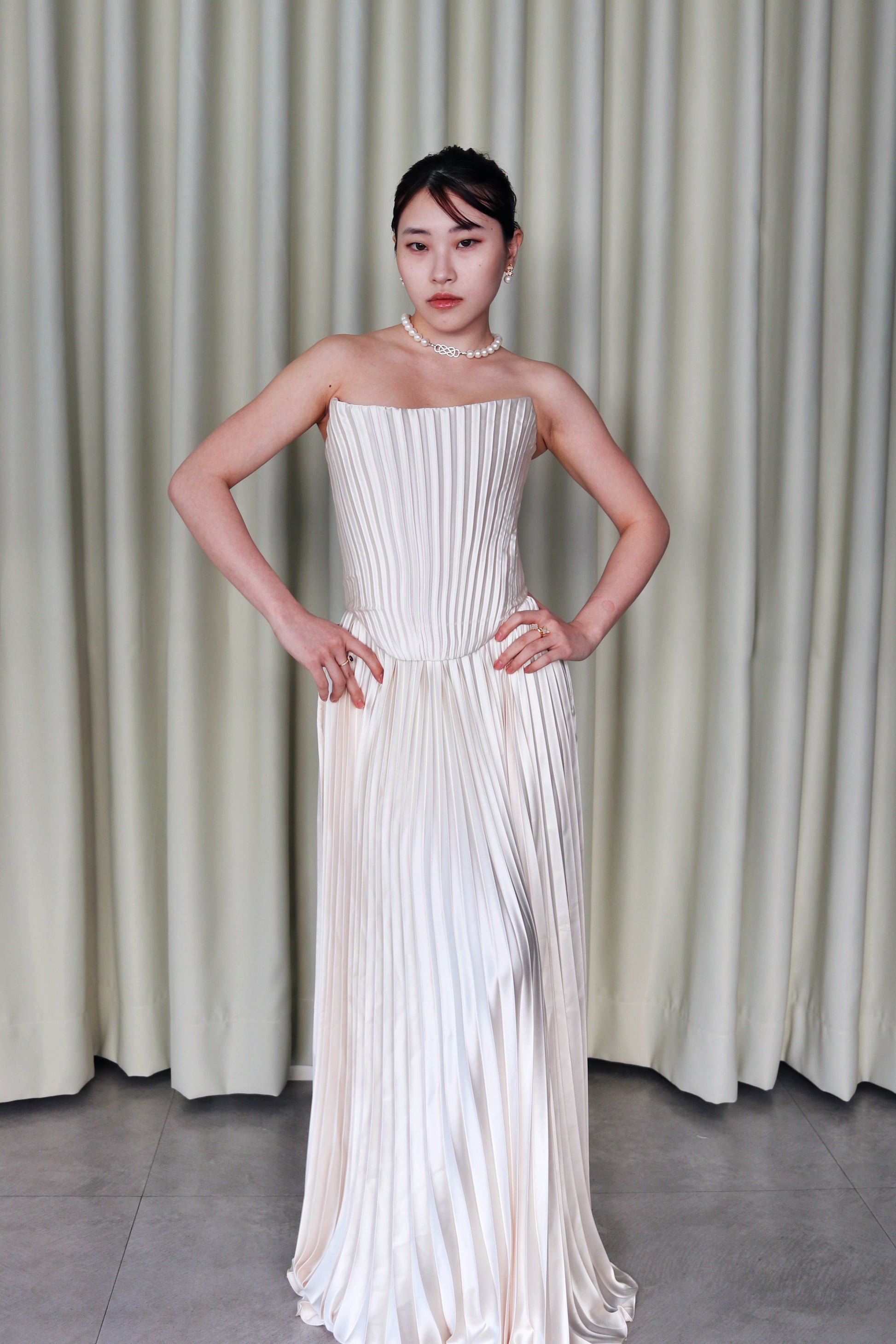The Rowena Electric Pleated Corset Look is crafted with excellence with the pleats’ added dimension, and uniquely classic ensemble. The tapered corset creates a cinched-waist look that is enhanced with the pleated skirt. The longitudinal pleats lengthen the wearer’s body, giving the illusion of a taller height. The Rowena look is perfect for formal events when worn together, but can be styled individually for everyday wear.