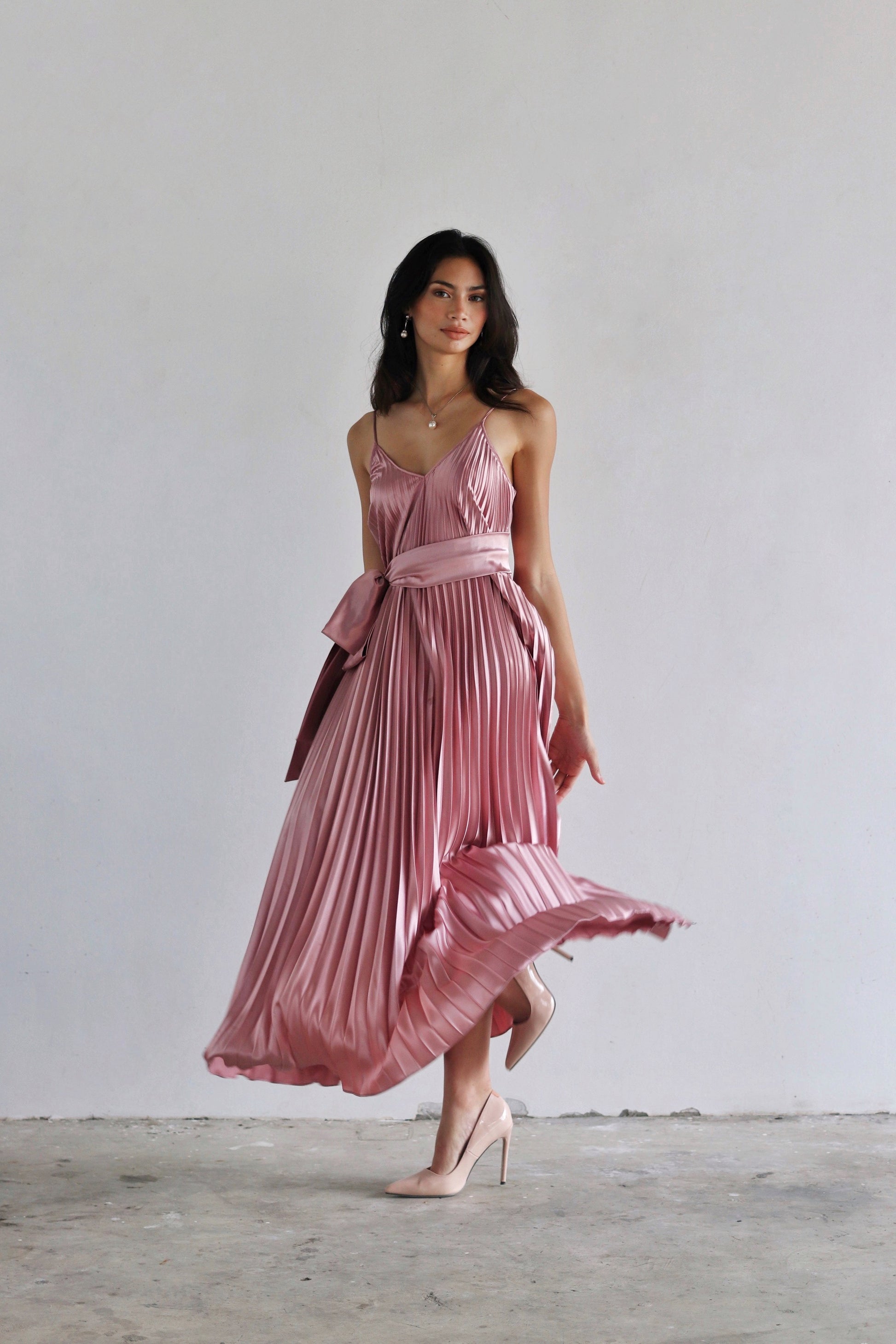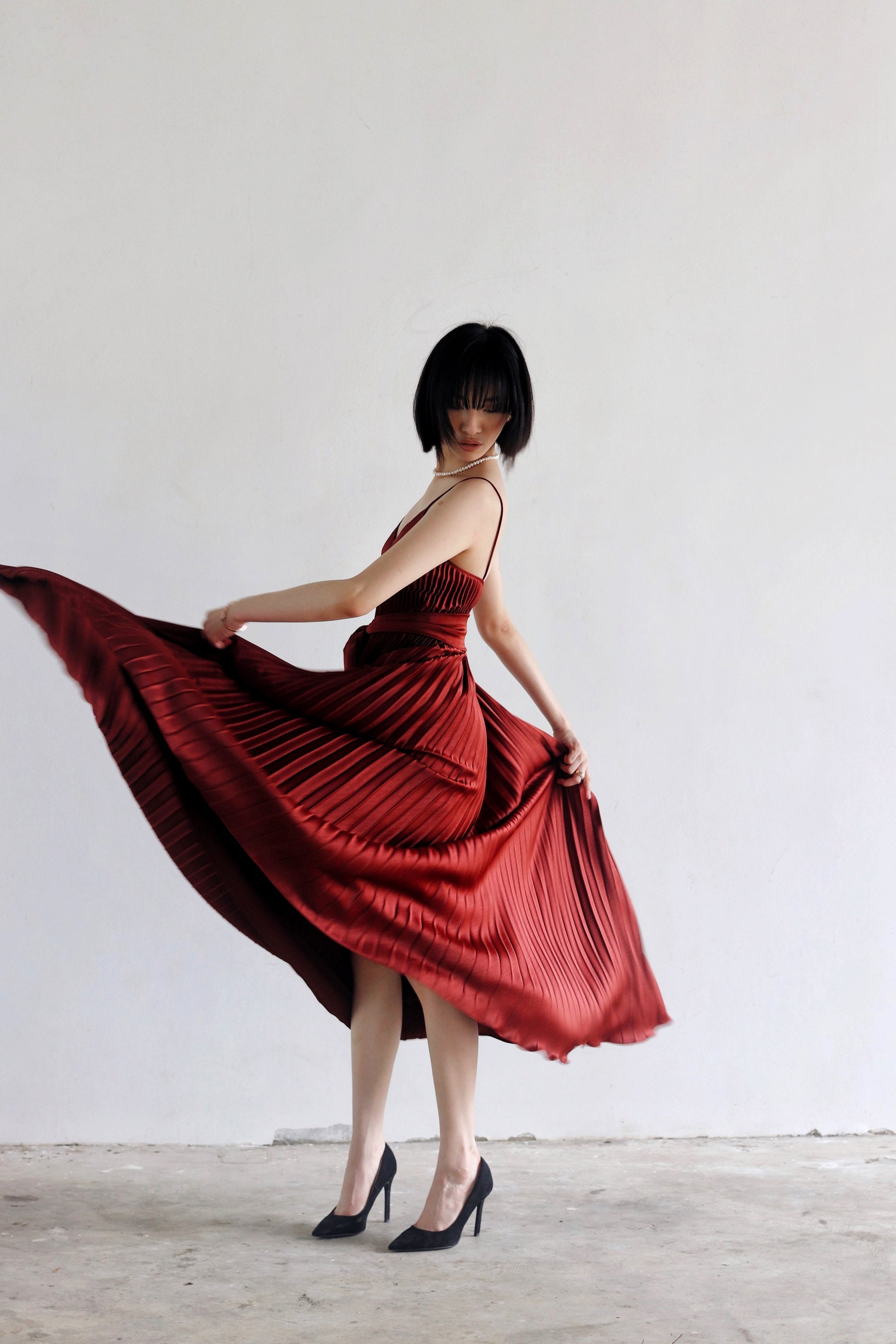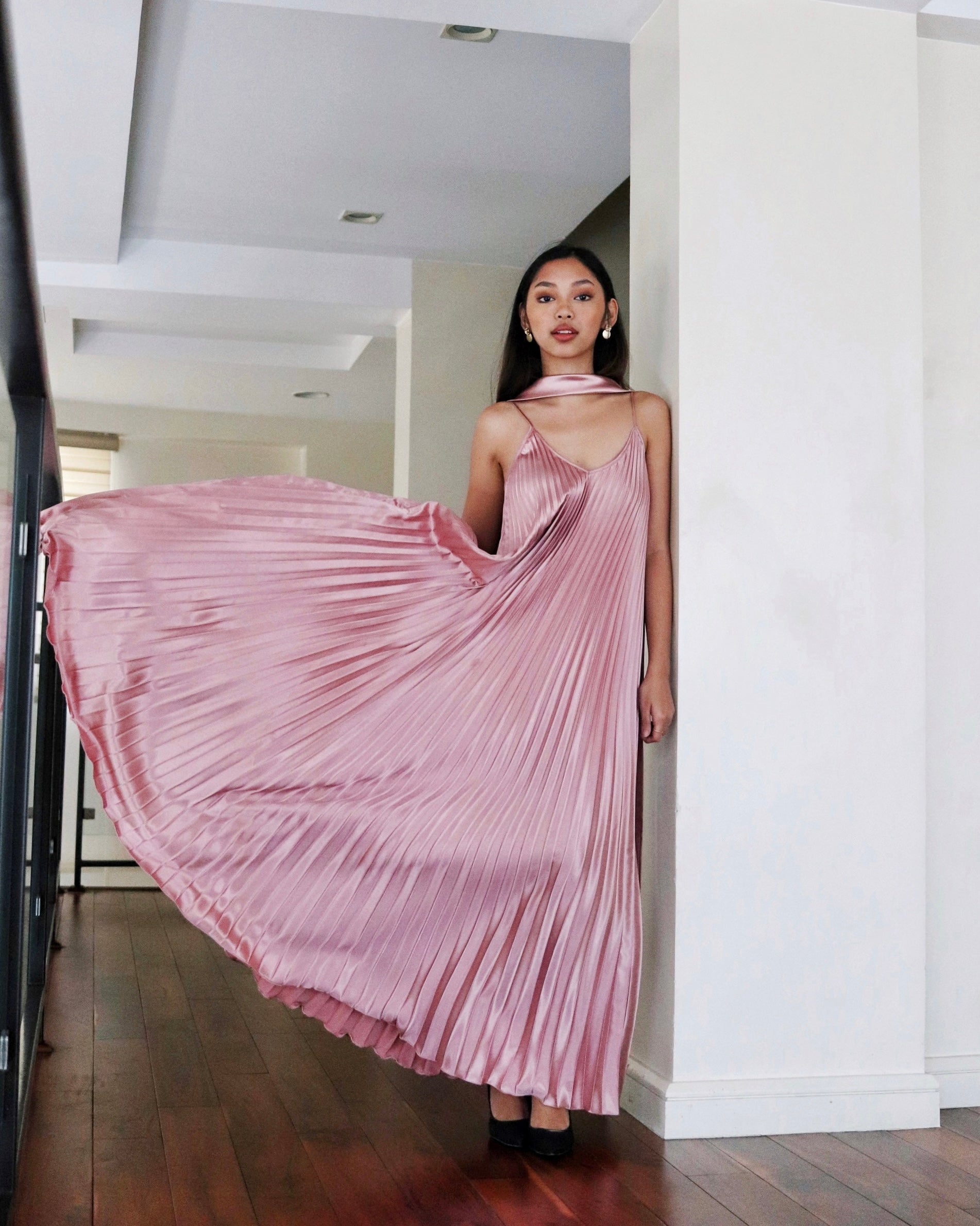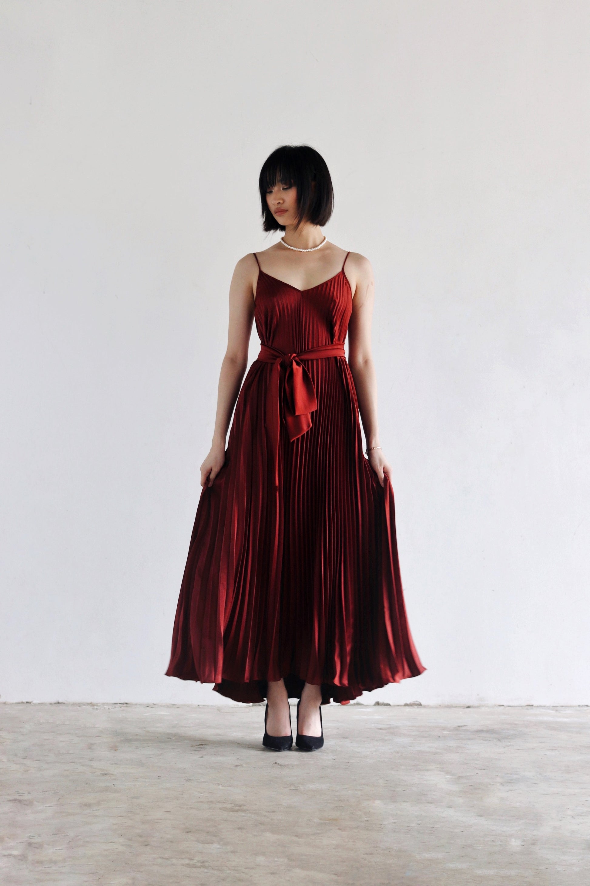 The Herite dress is a relaxed vertically-pleated dress. The pleats are flowy and offer room for movement. The dress can be worn with a sash for a cinched look, or without the sash for a relaxed drape.
