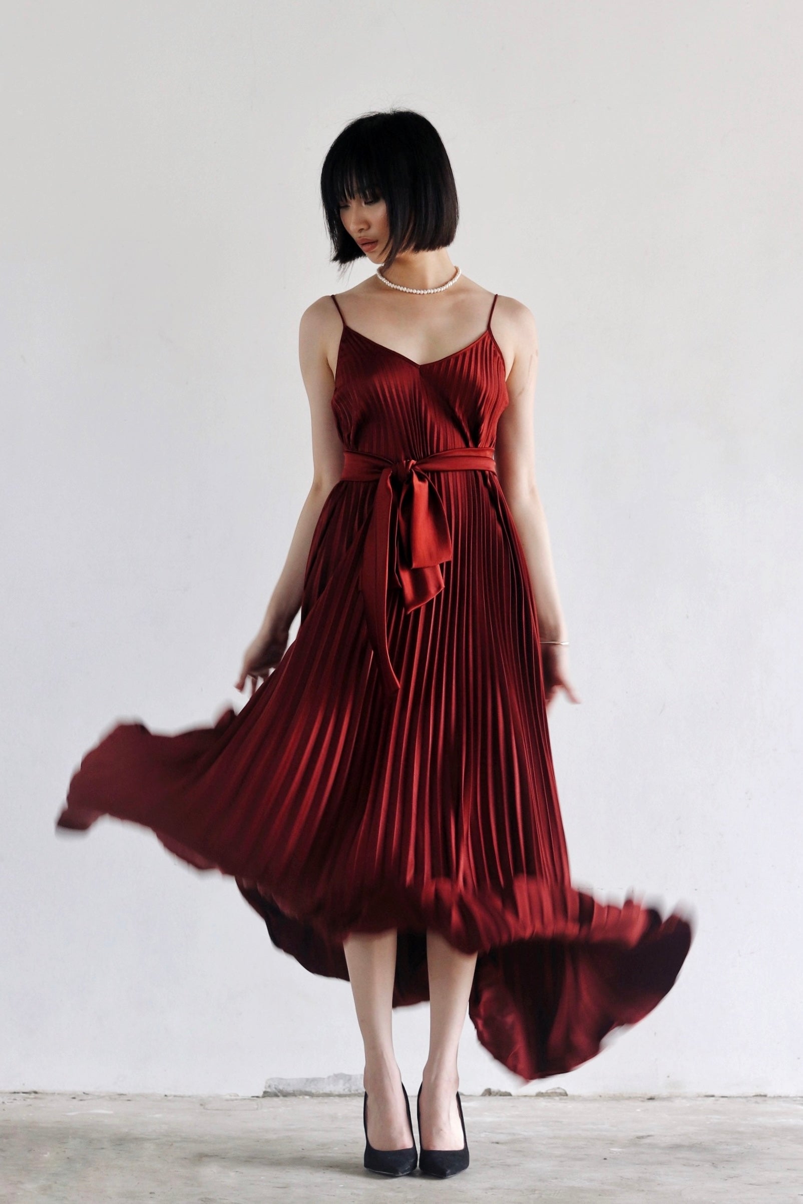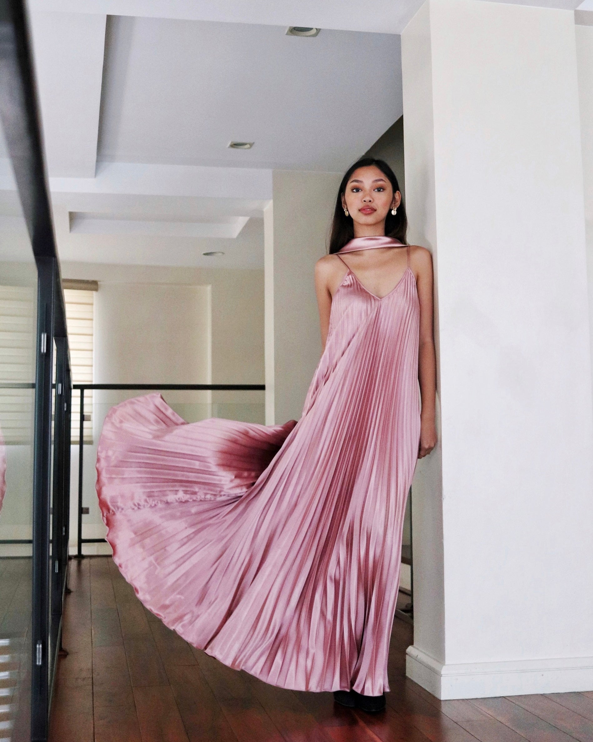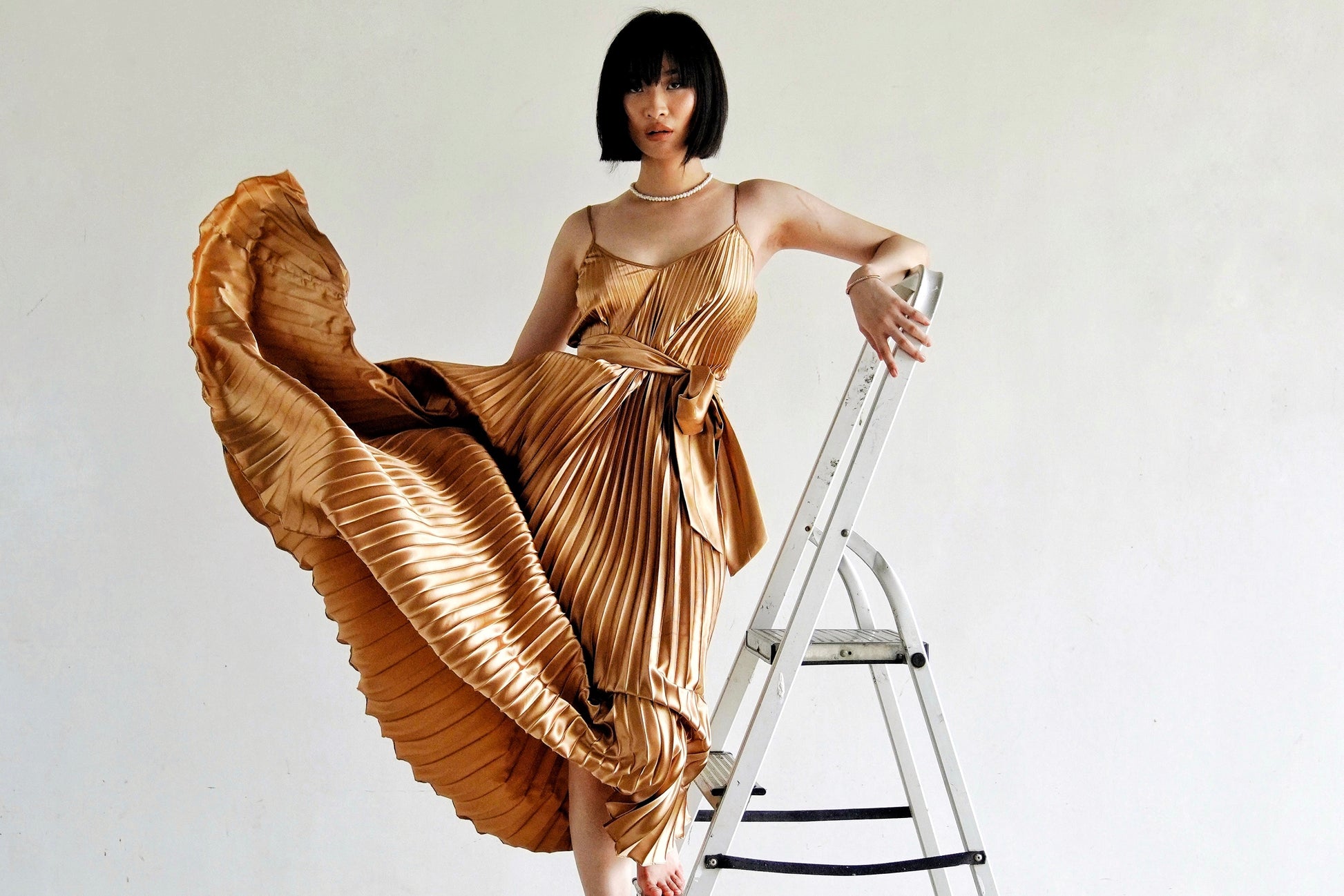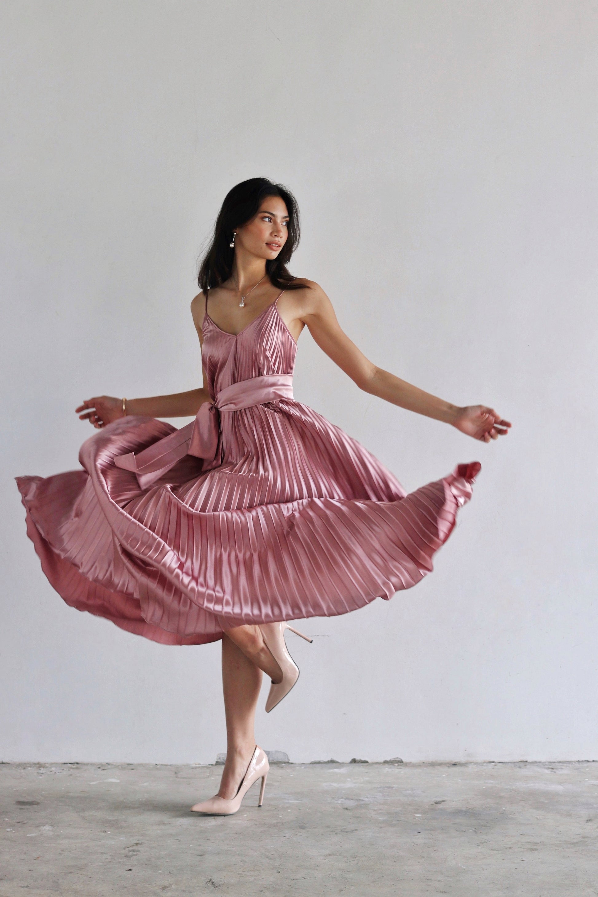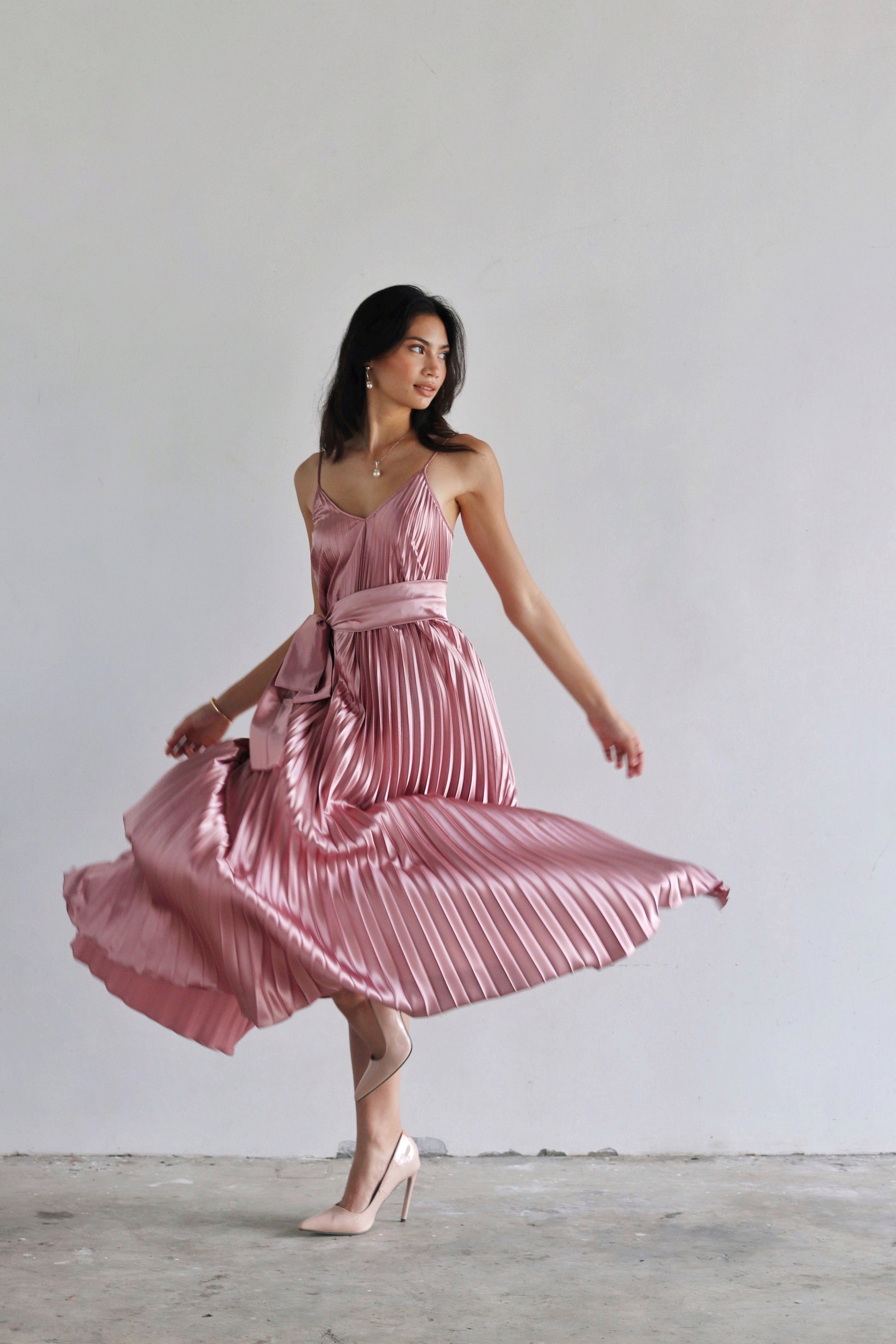 The Herite dress is a relaxed vertically-pleated dress. The pleats are flowy and offer room for movement. The dress can be worn with a sash for a cinched look, or without the sash for a relaxed drape.