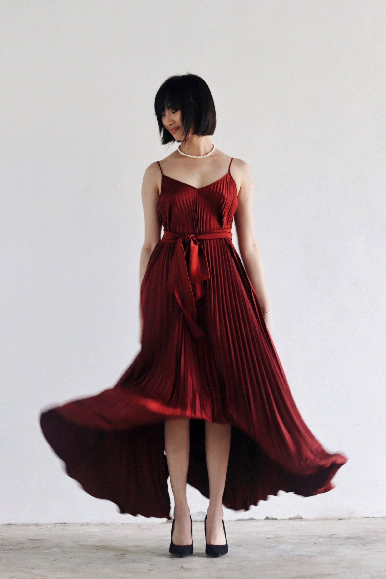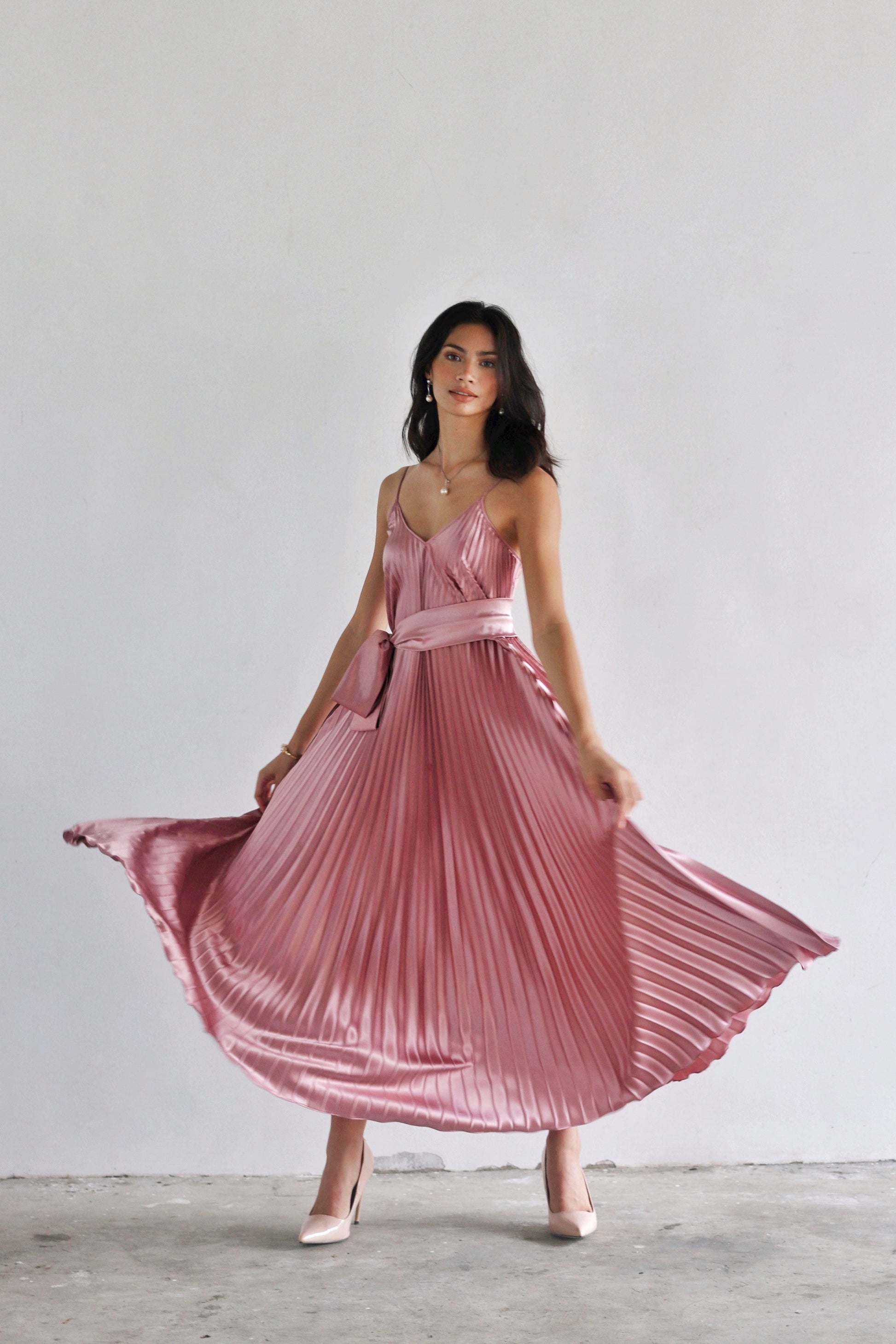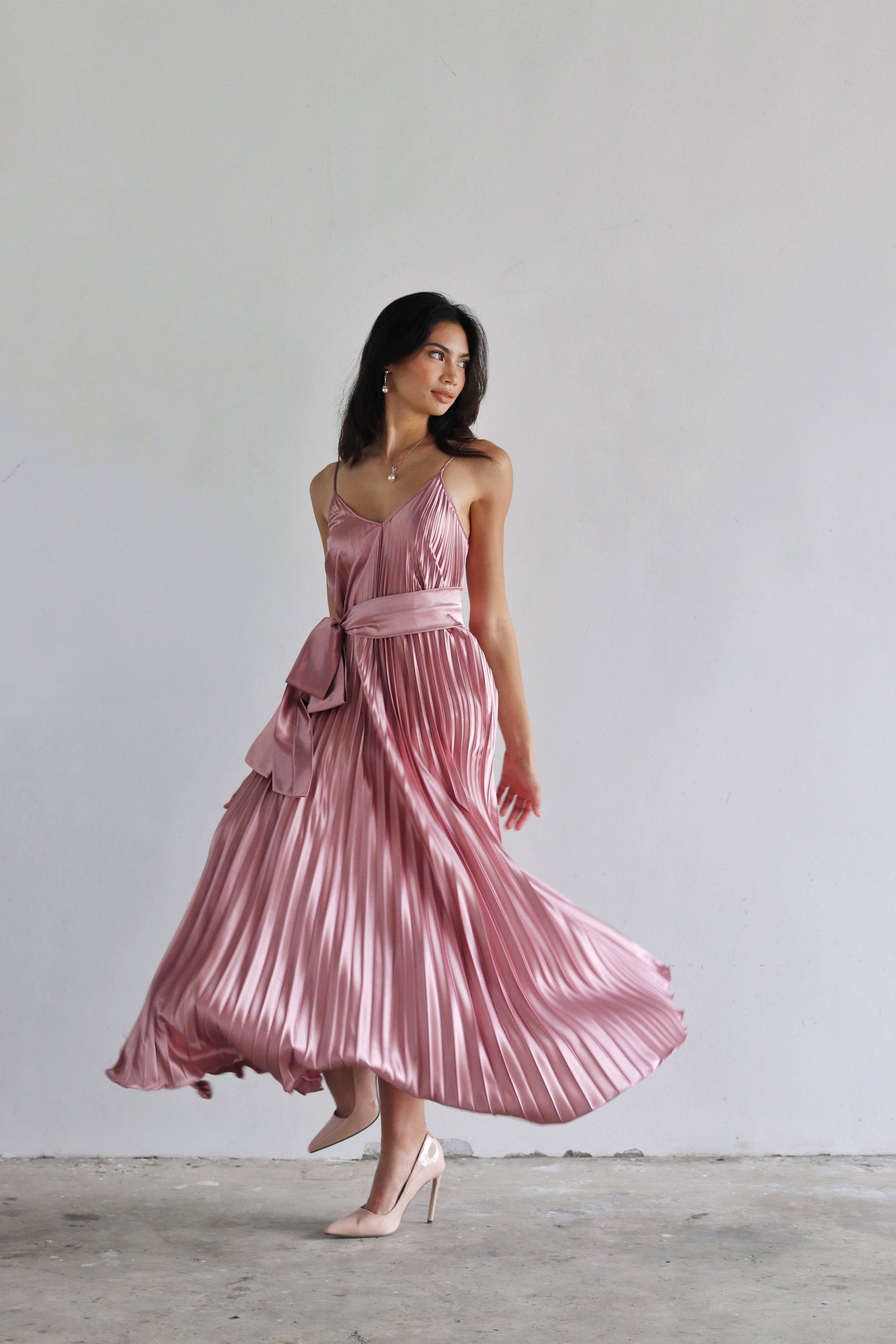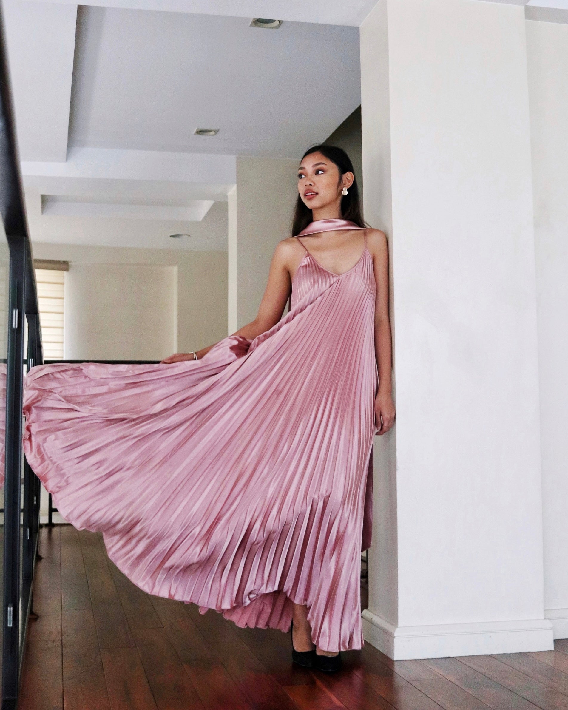 The Herite dress is a relaxed vertically-pleated dress. The pleats are flowy and offer room for movement. The dress can be worn with a sash for a cinched look, or without the sash for a relaxed drape.