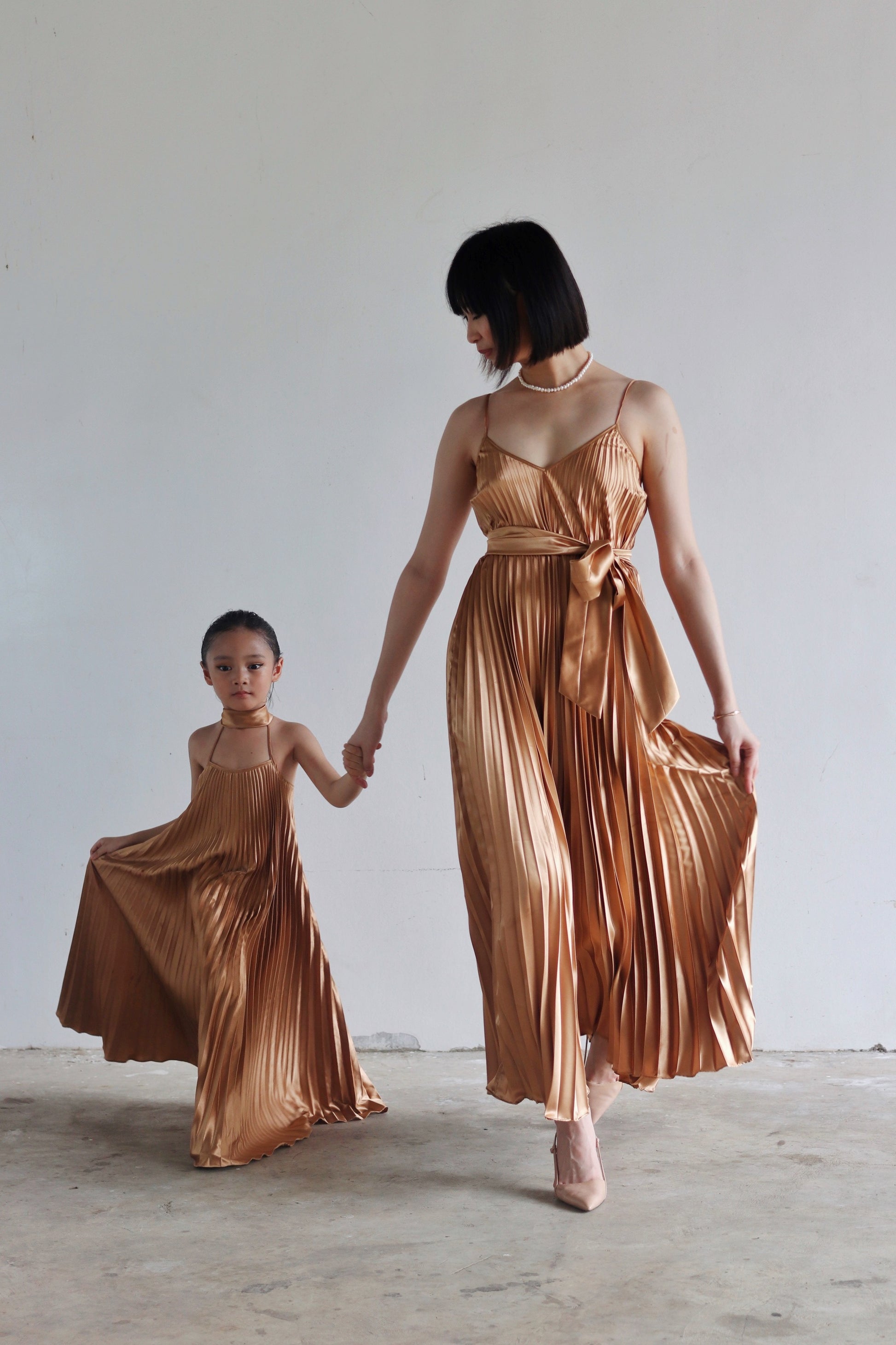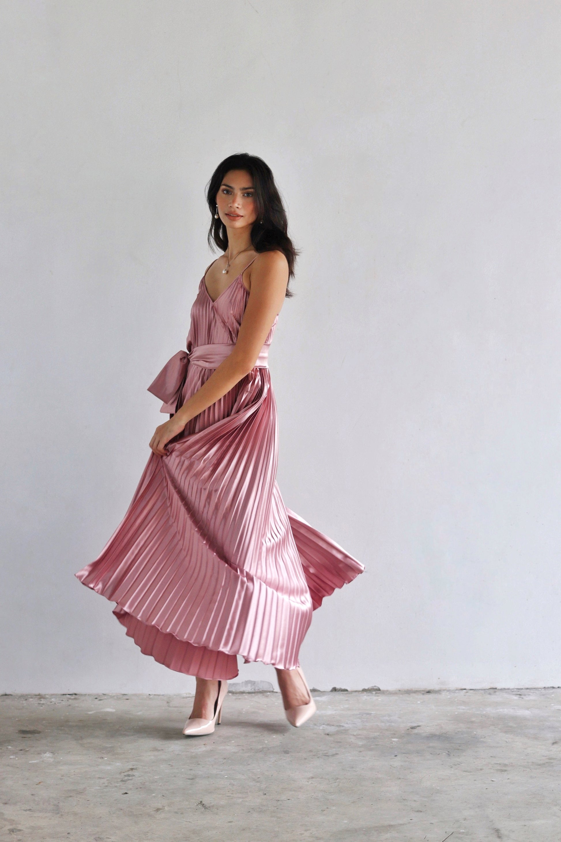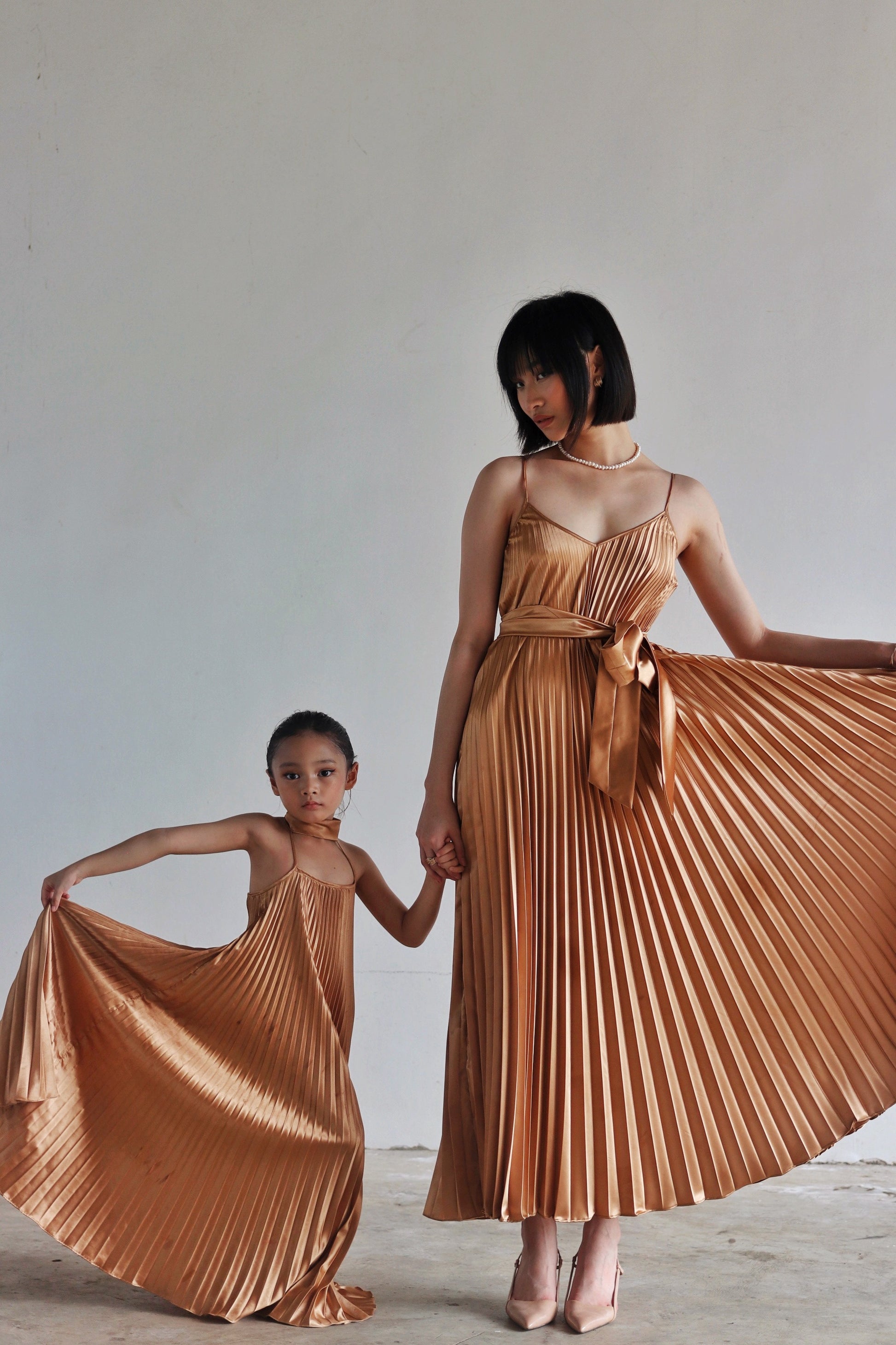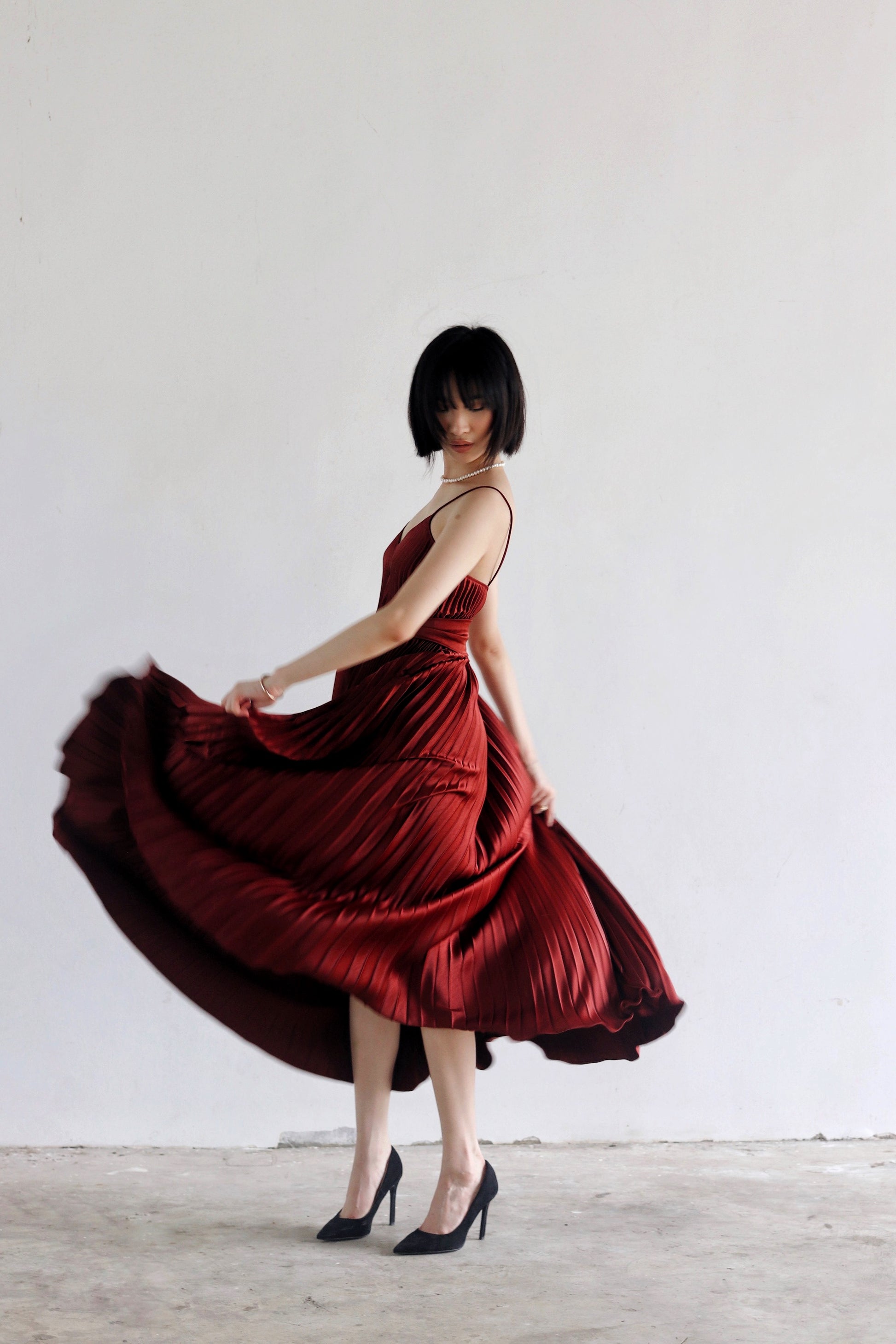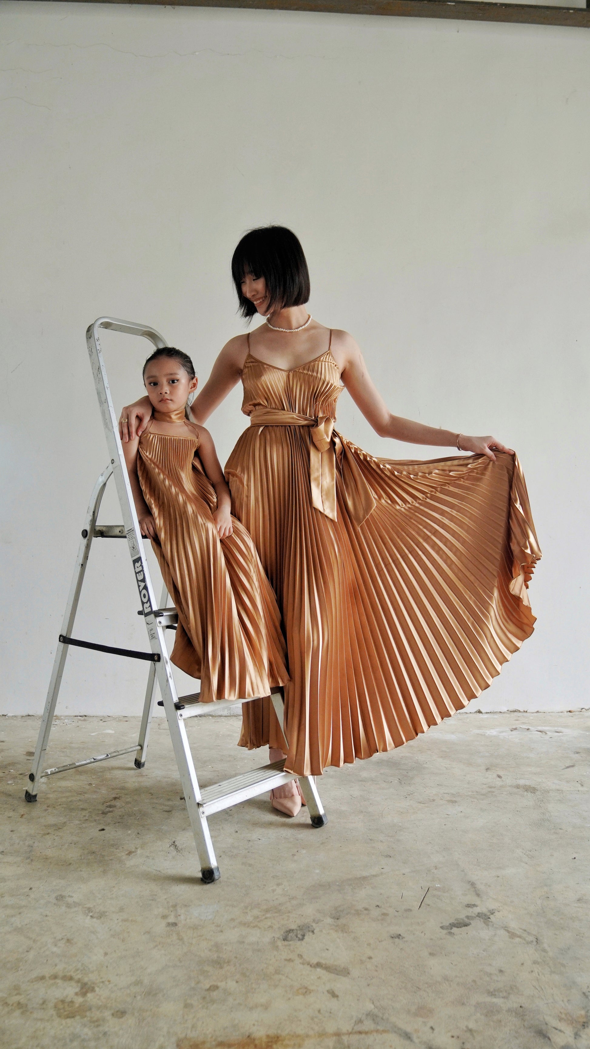 The Herite dress is a relaxed vertically-pleated dress. The pleats are flowy and offer room for movement. The dress can be worn with a sash for a cinched look, or without the sash for a relaxed drape.