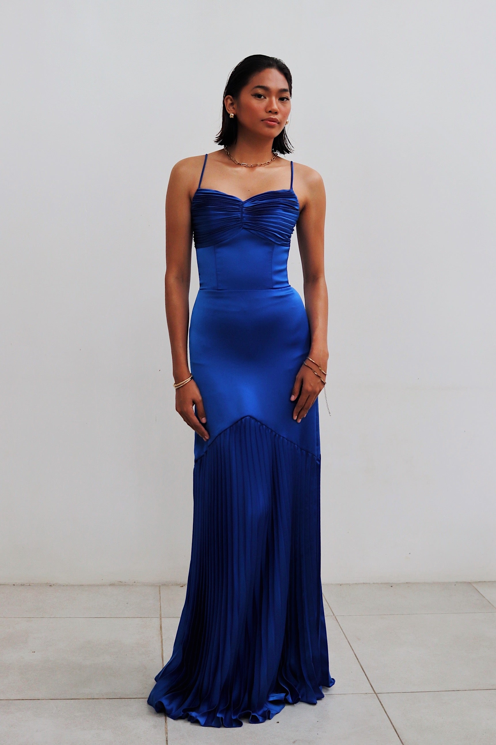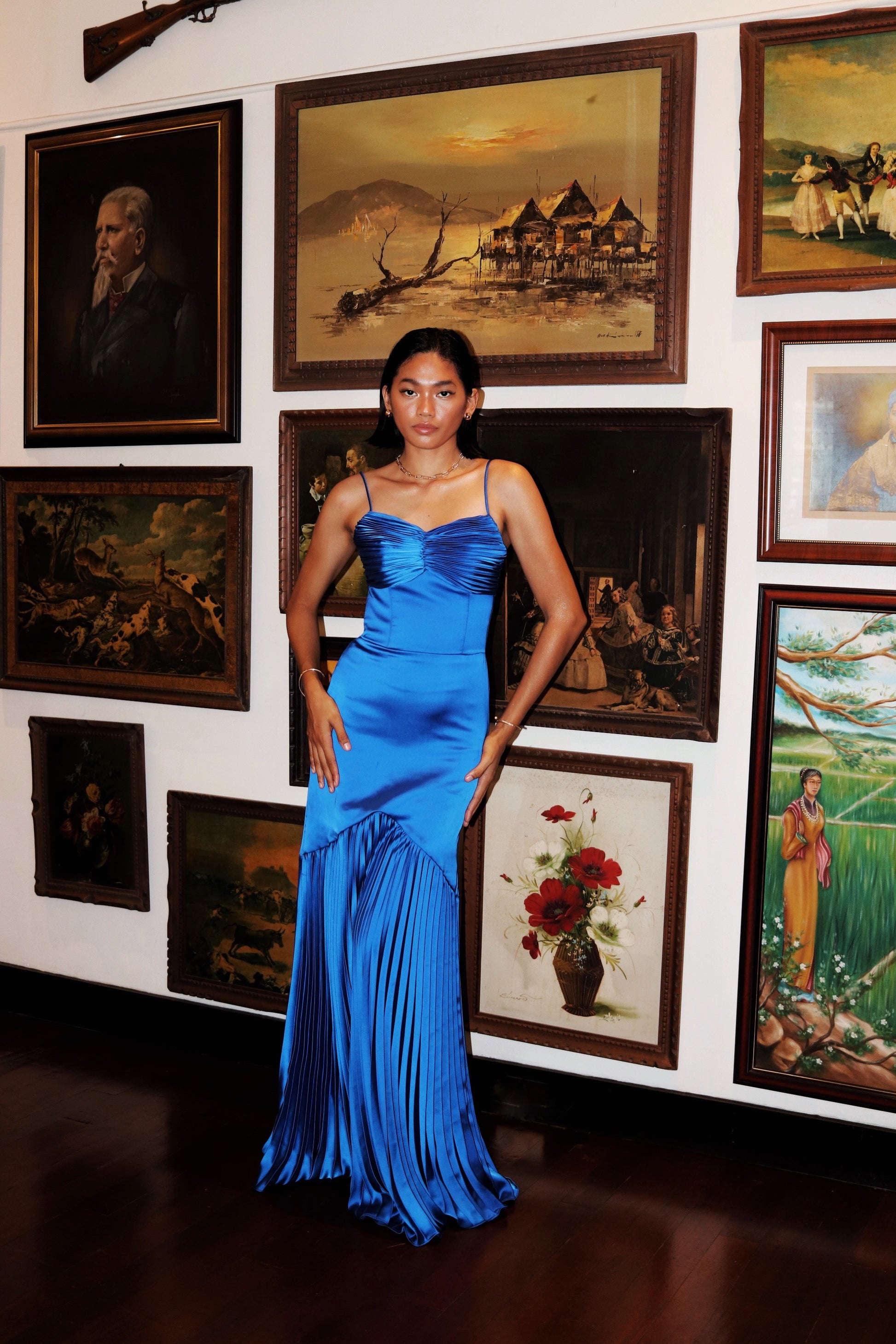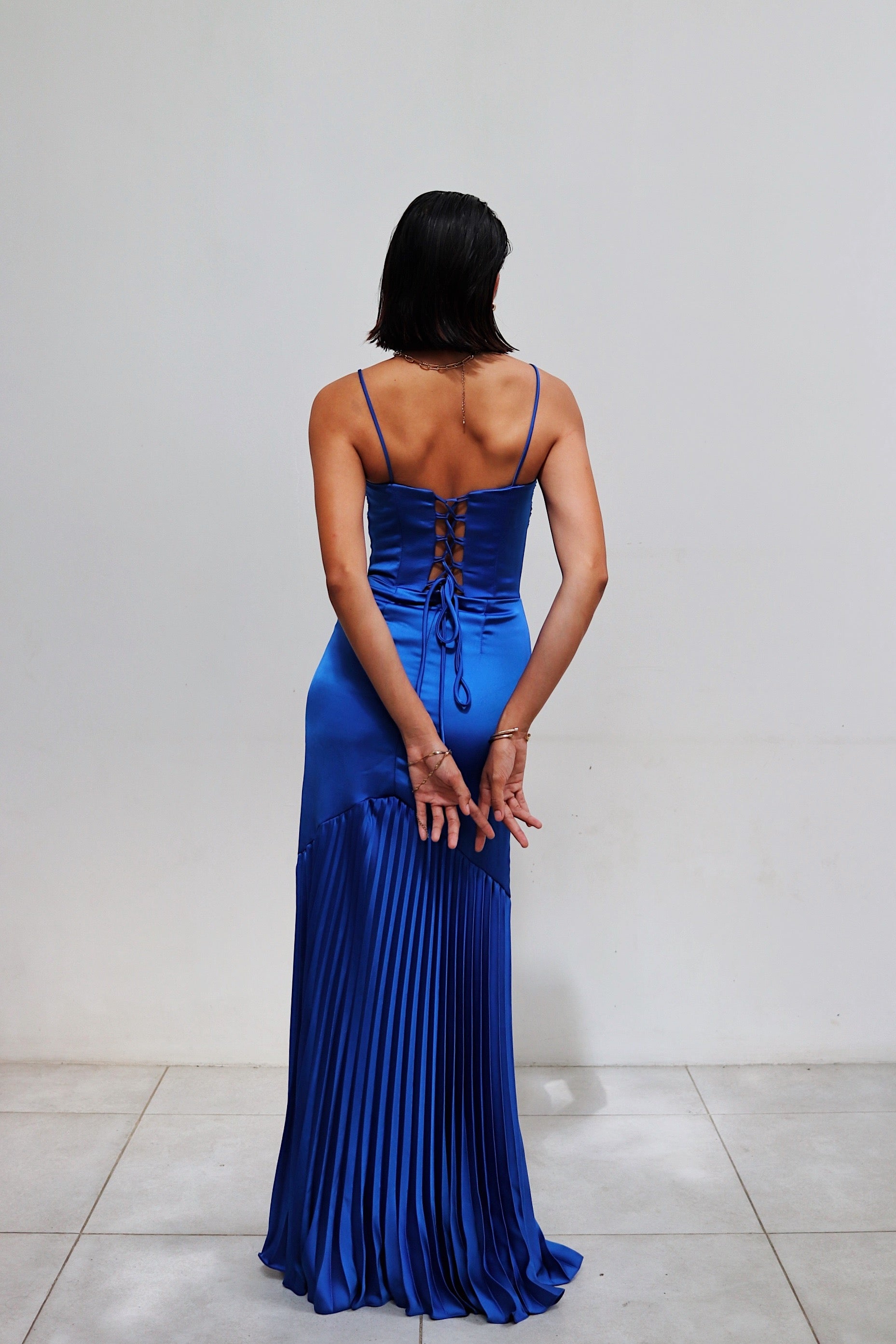 The Astraea is a corset dress effortlessly capturing the essence of modern femininity. The mermaid silhouette gracefully hugs the curves before cascading into a sculpted flare, creating a striking yet flattering shape. Its pleated bust is both delicate and sophisticated, while the pleated lower half of the skirt adds depth and movement, swaying with every step. The sweetheart neckline frames the décolletage with an air of romance, while the lace-up back introduces an element of daring allure, accentuating the silhouette with subtle sensuality. Thin straps add lightness to the design, making it a perfect harmony of structure and elegance.