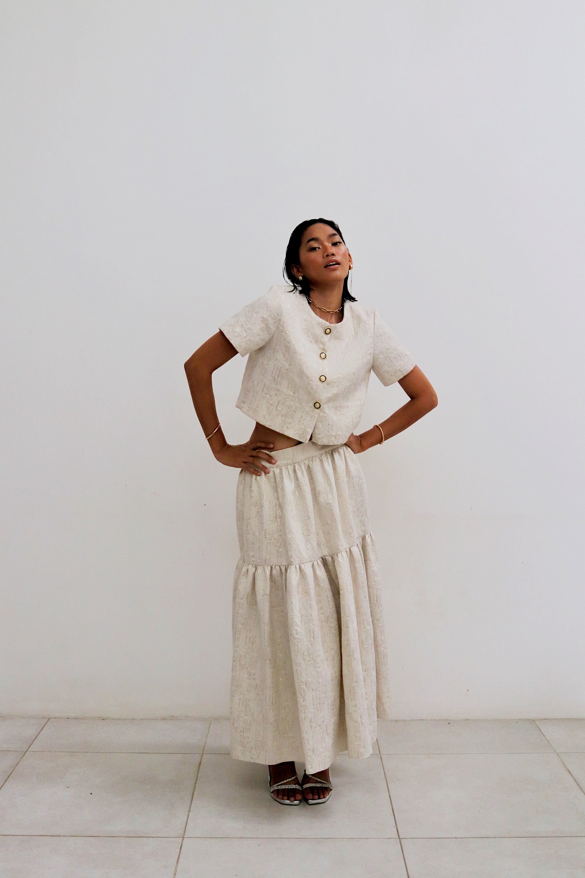 The Meleanule coordinated set features a tailored crop top with full lining, detailed with gold and black buttons for a refined touch. It is paired with a tiered A-line skirt, both crafted from premium jacquard fabric for a sophisticated, structured look. This set combines elegance and precision in design, making it a versatile and polished choice for an elevated everyday look.