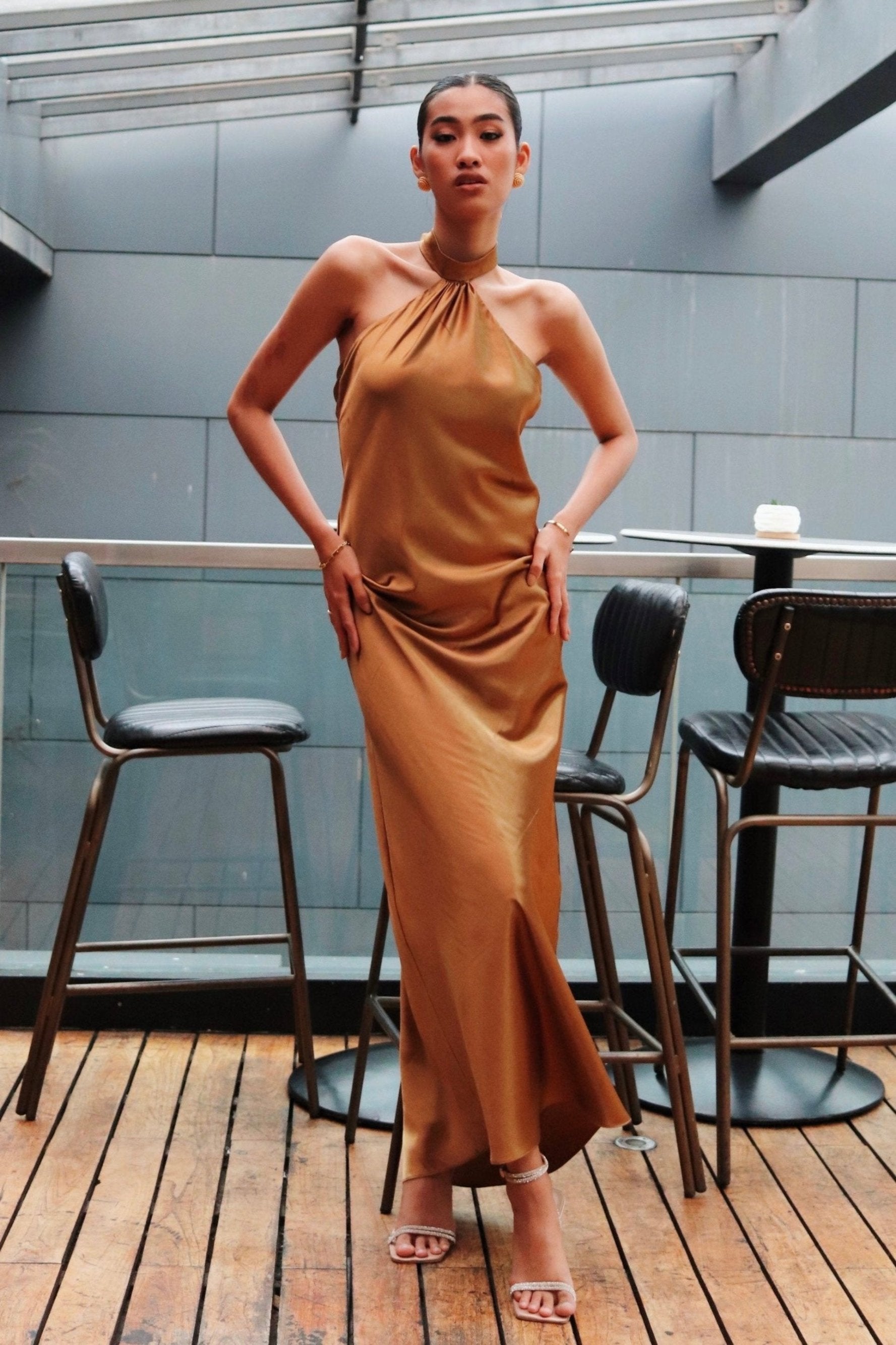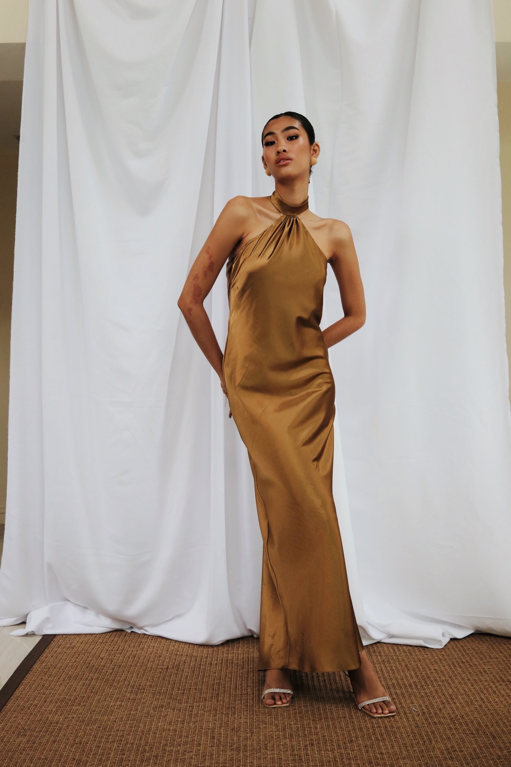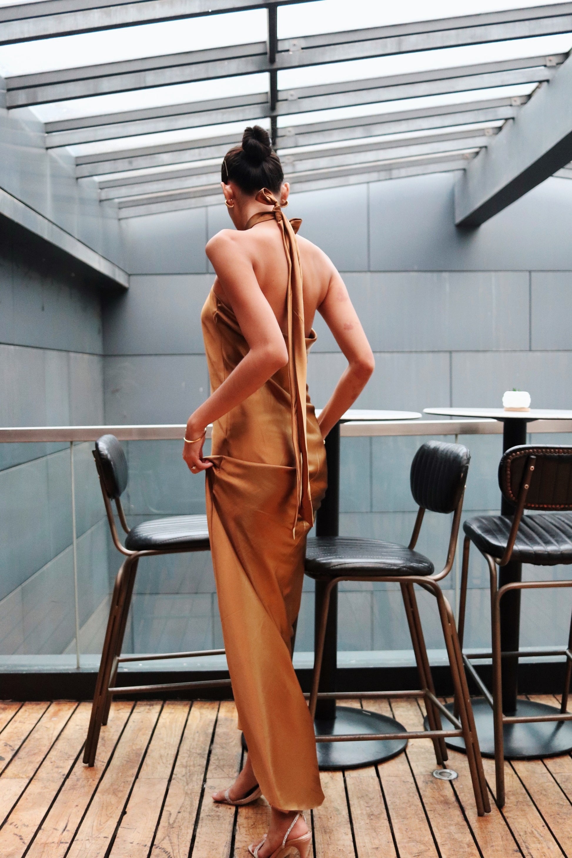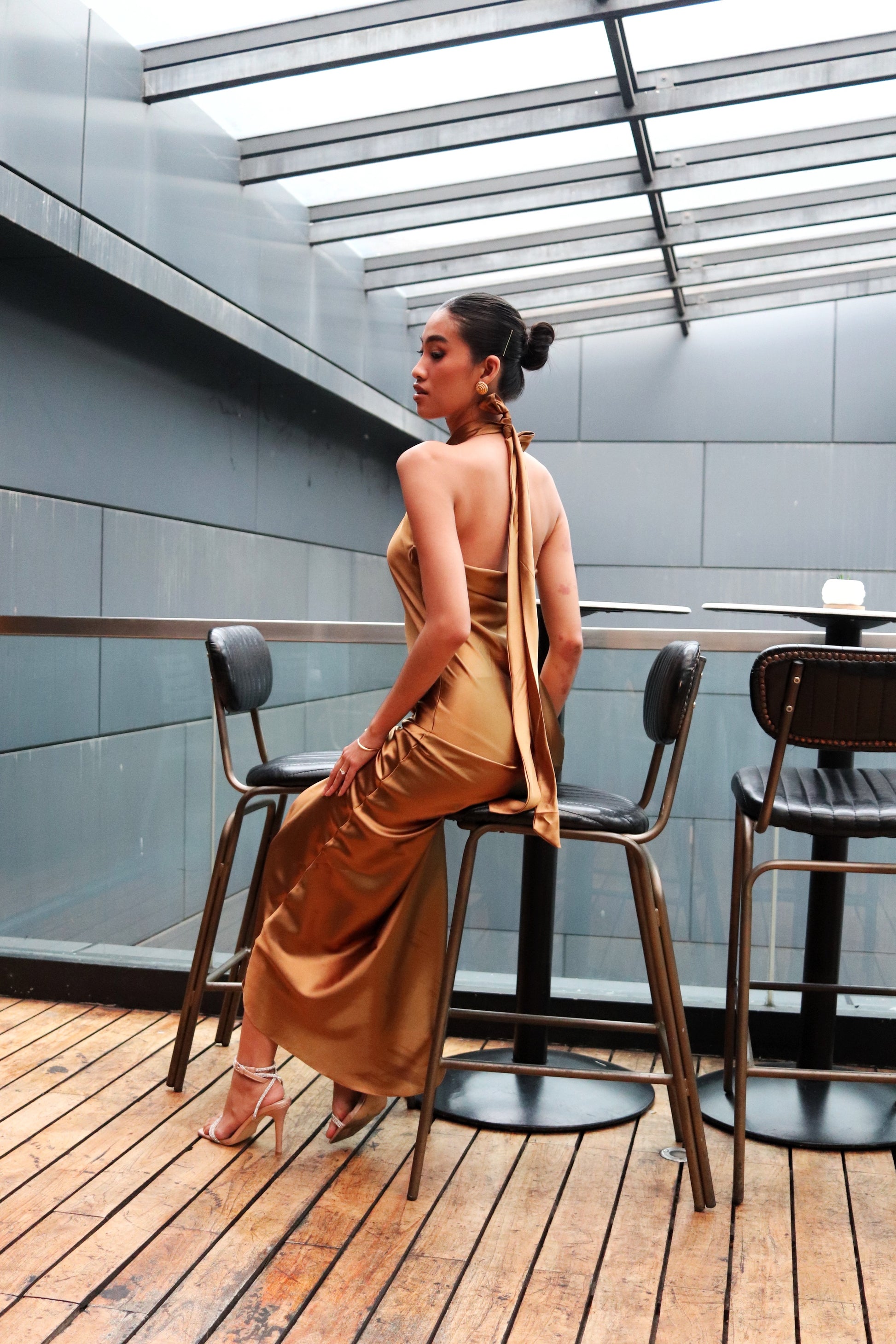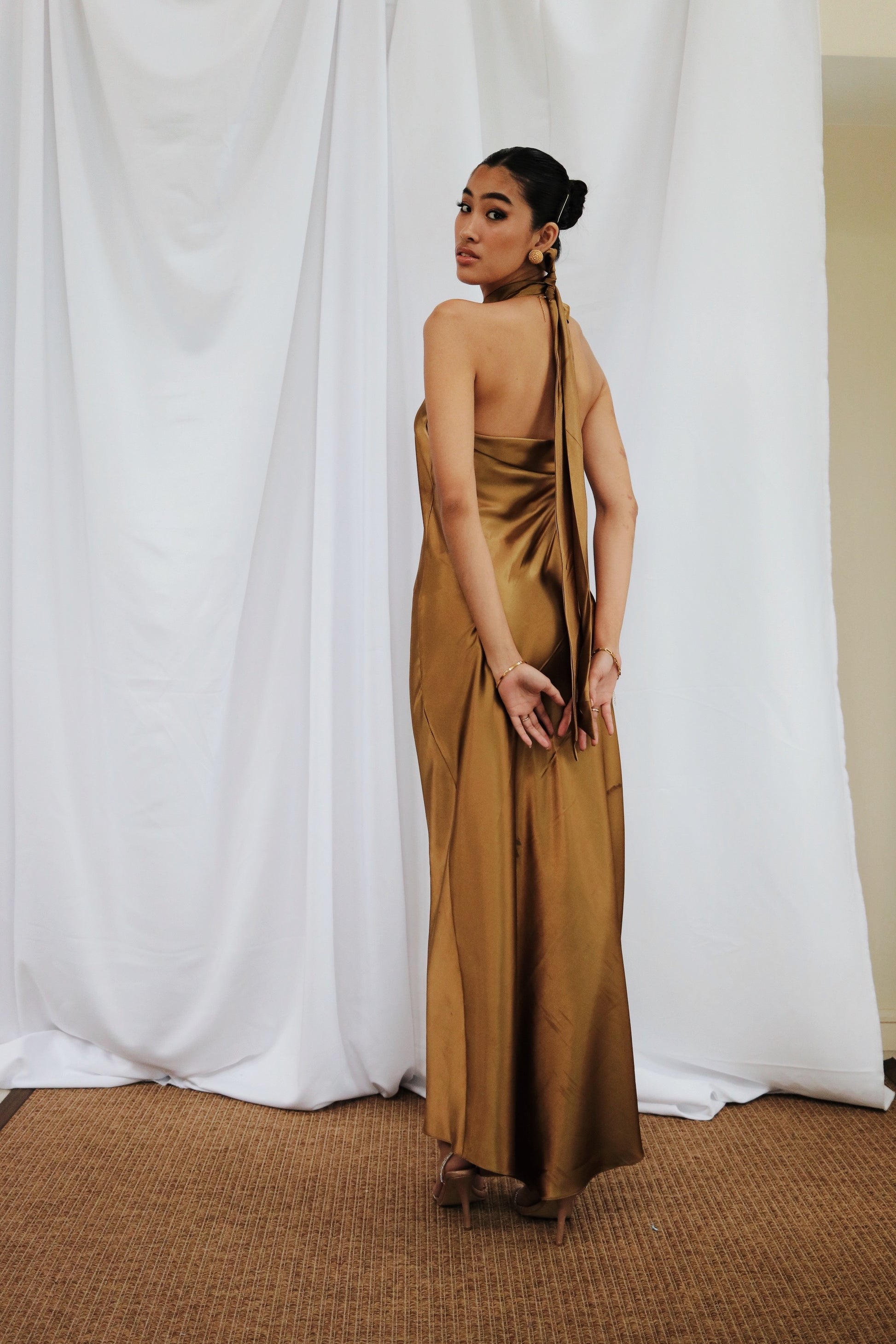 The Nirvana dress is a halter design with a collar seamlessly connected to an open-tie ribbon and cowl back.